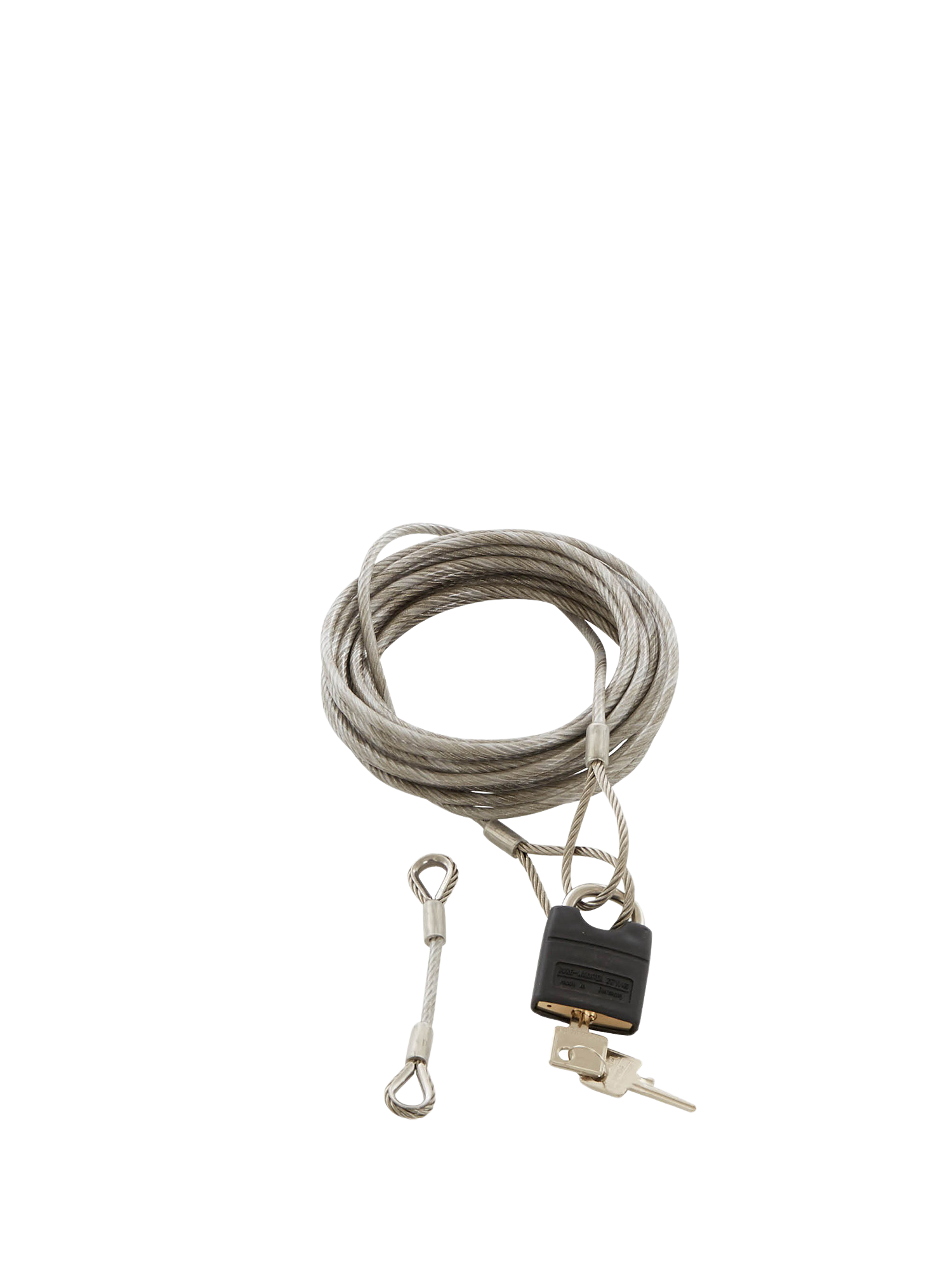 Das Sicherungsset besteht aus einem 5 mm starken, beweglichen Edelstahlseil, das mit transparentem Kunststoff ummantelt ist, einer Edelstahlöse, die am Tischbein befestigt wird und einem rostfreiem Schloss.