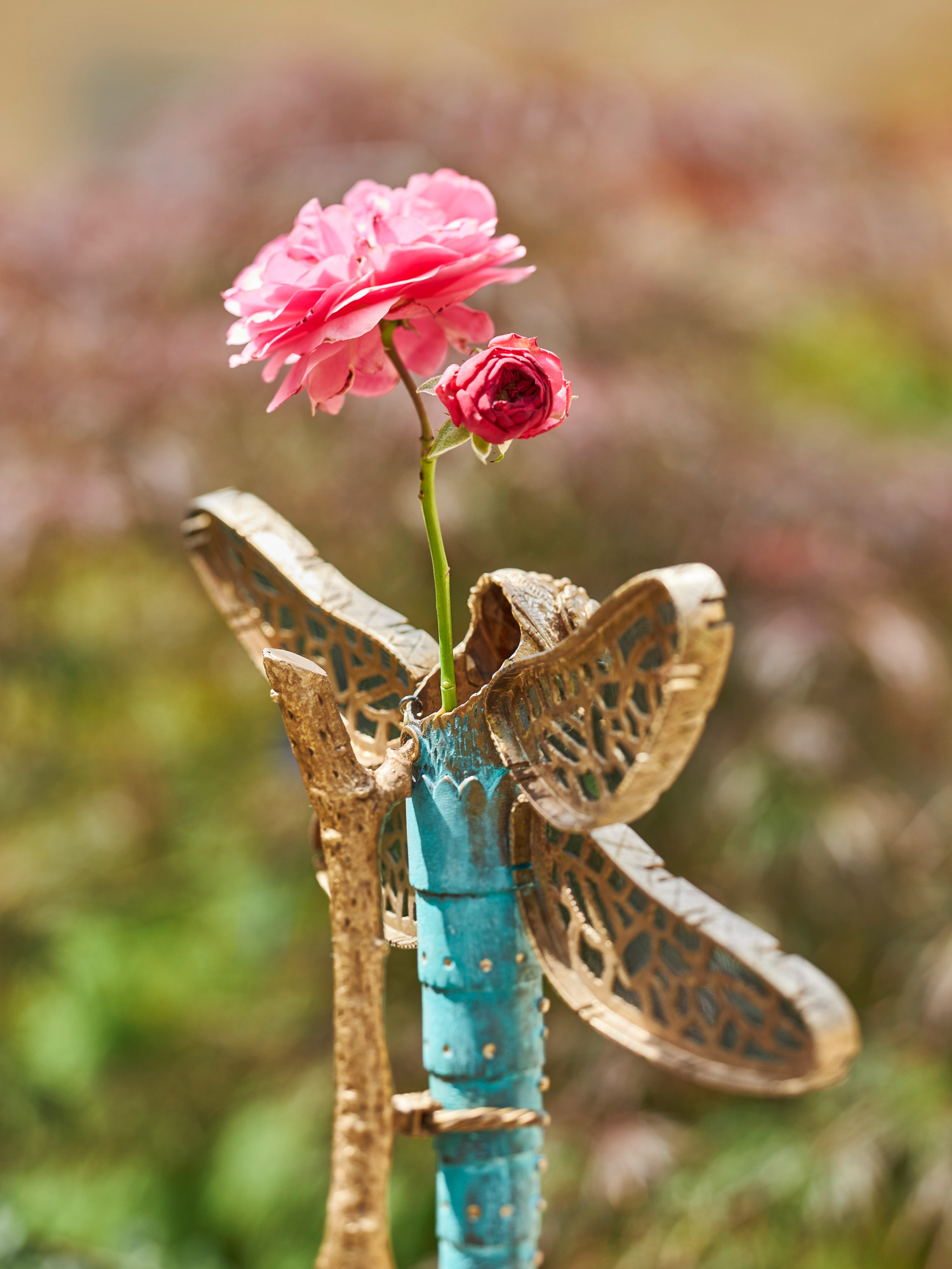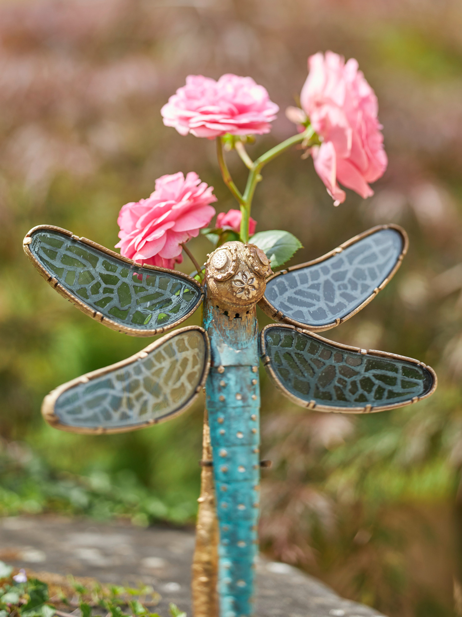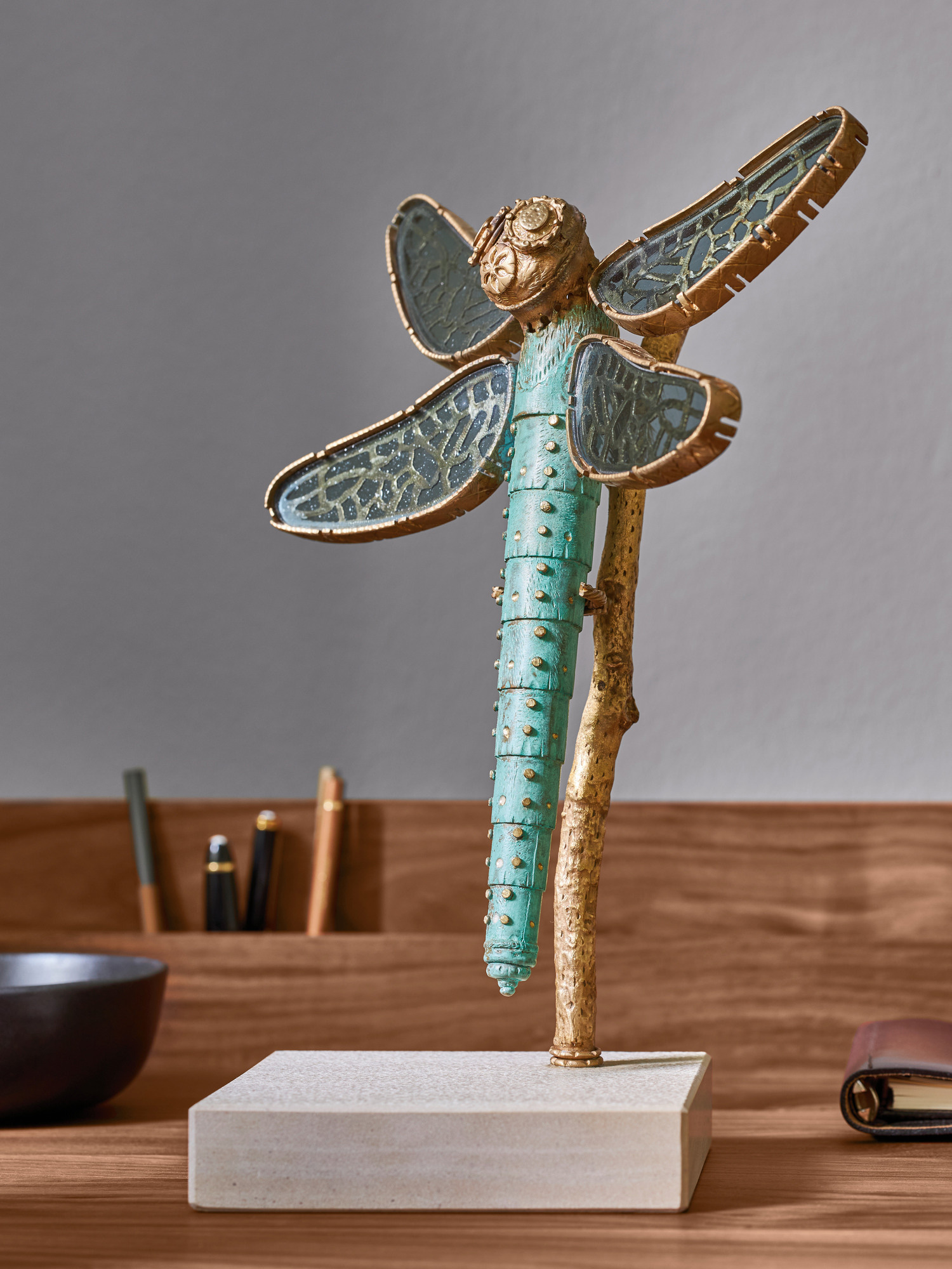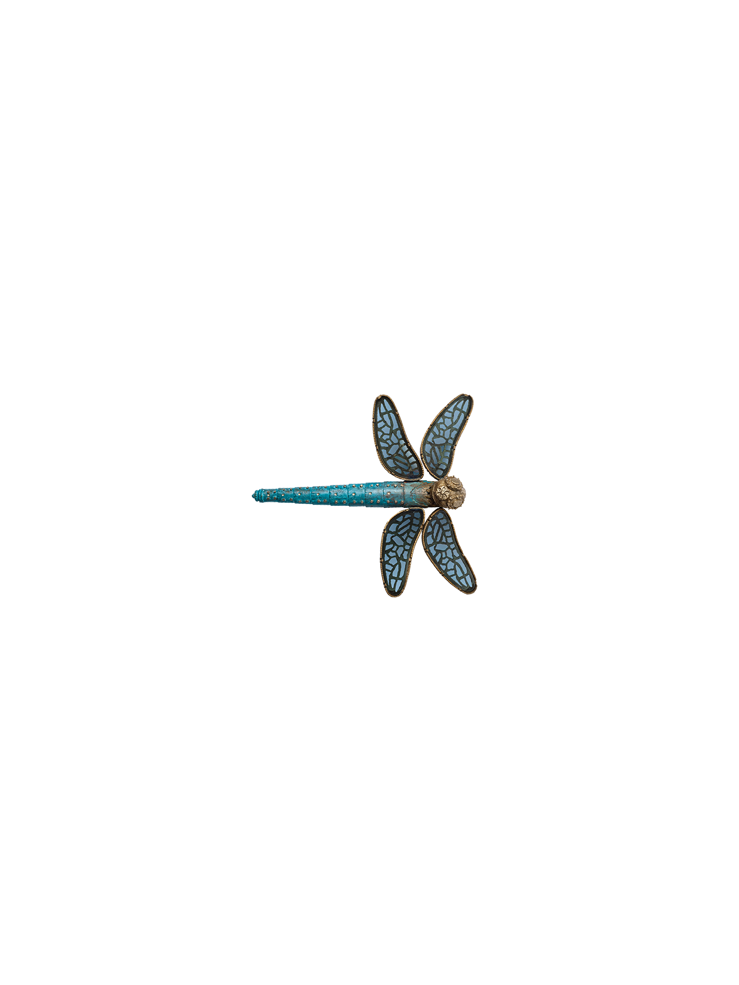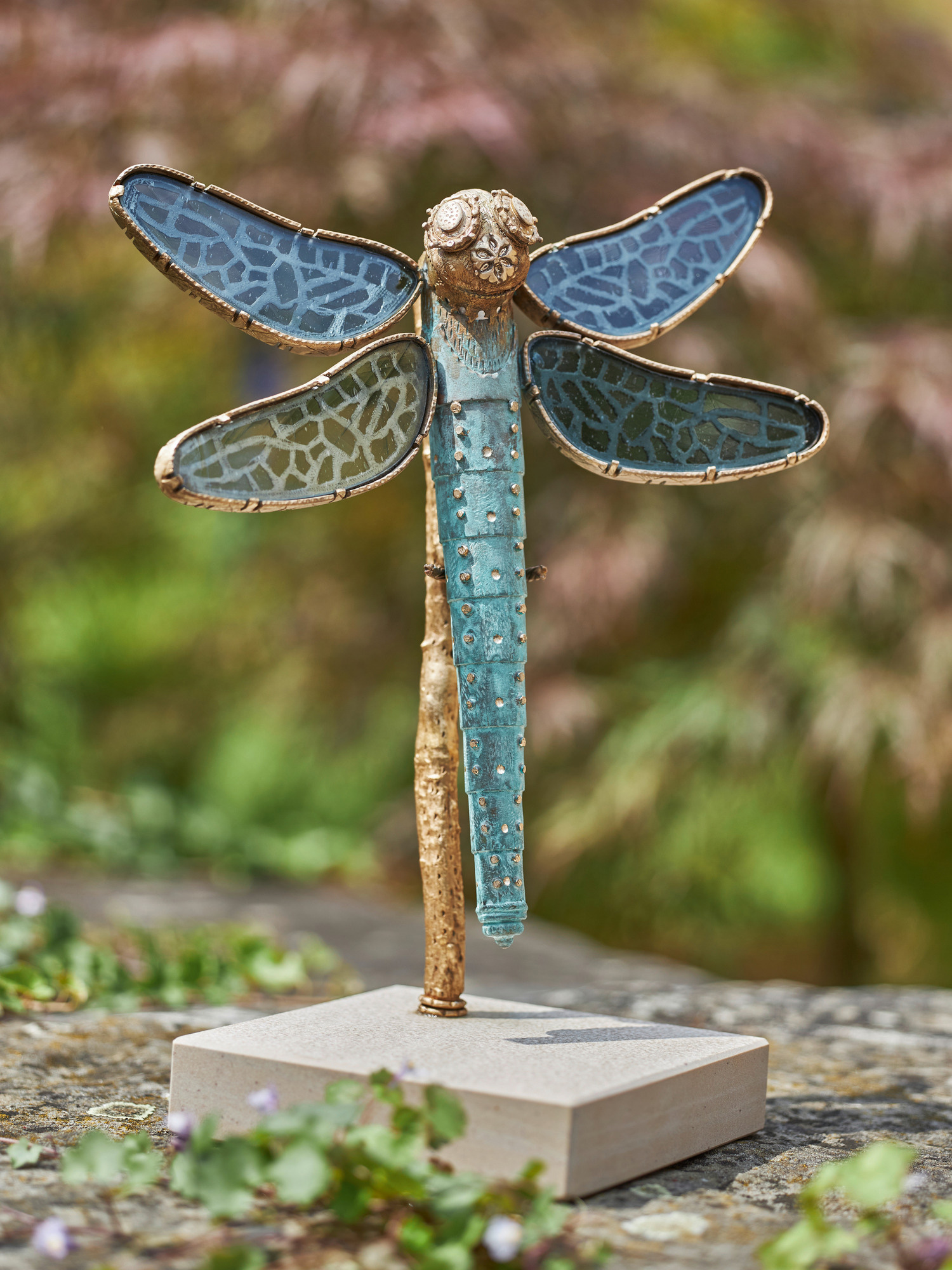 Zunächst modellierte die Künstlerin die Libelle in Silber. Anschliessend kam in einer Kunstgiesserei das aufwendige Wachsausschmelzverfahren zum Einsatz. Einem künstlichen Alterungsprozess unterzogen, schimmert die Bronze schliesslich in zartem Türkis. Das mundgeblasene Antikglas für die Flügel – von einer Kirchenglasschneiderin zugeschnitten – kommt aus einer traditionellen Oberpfälzer Manufaktur.