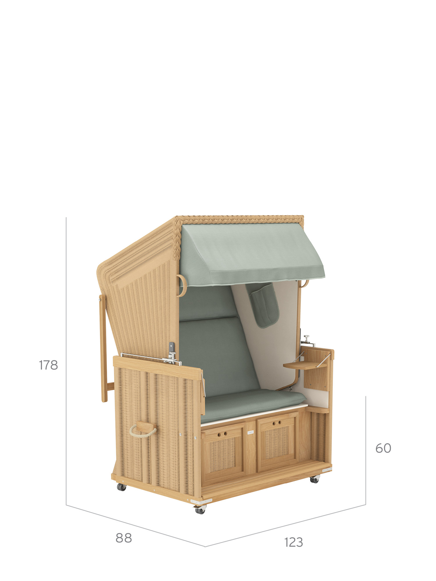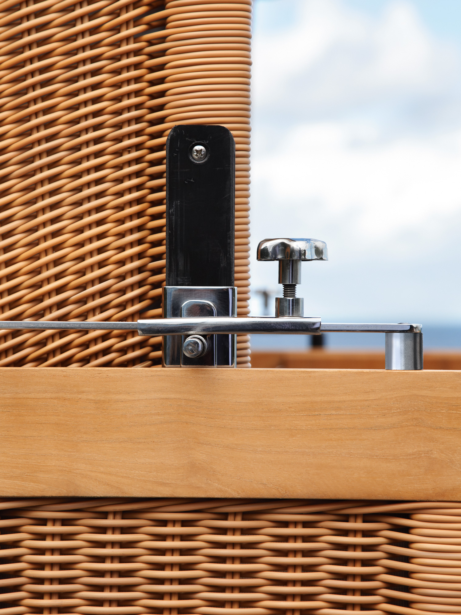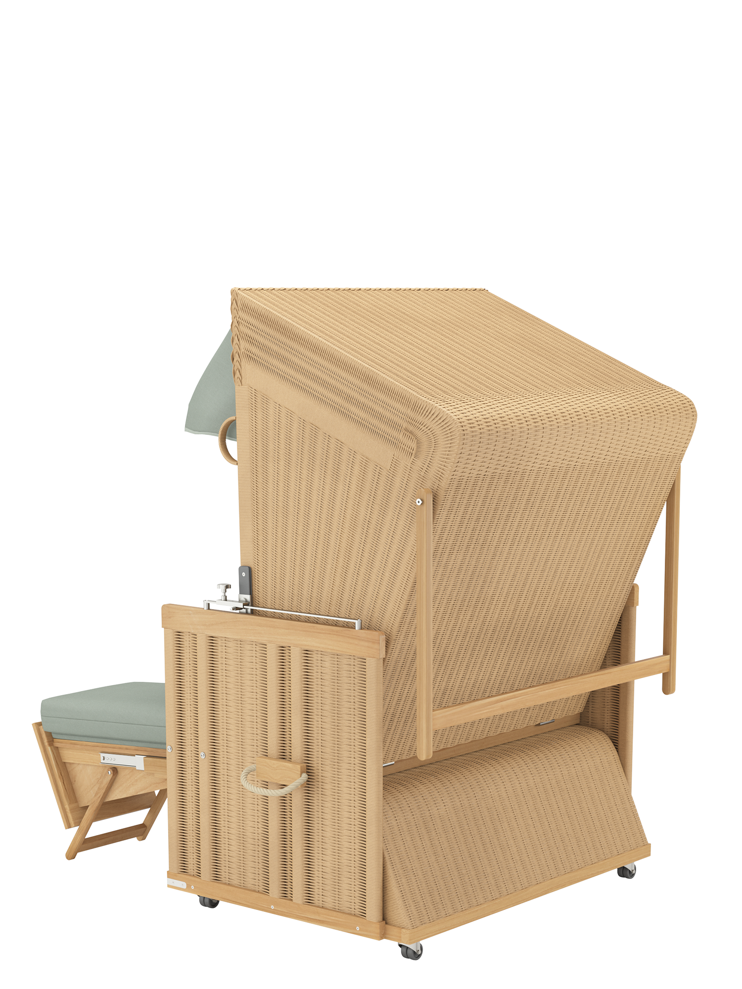 Der Strandkorb besteht aus einem massiven Teakkorpus, der mit einem wetterfesten Kunststoffgeflecht und Edelstahlbeschlägen kombiniert wird. Der elegante Stoff ist unempfindlich und bis auf die Innenauskleidung abnehm- und waschbar.