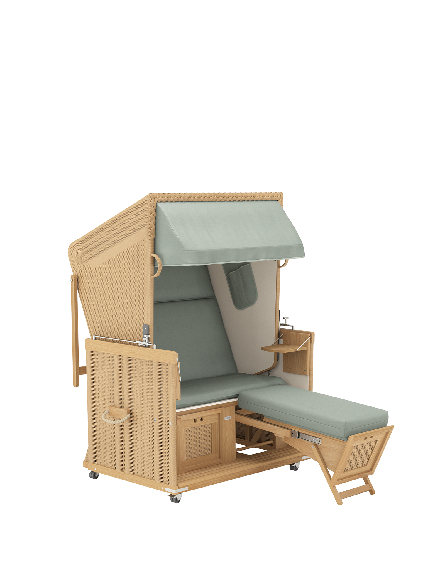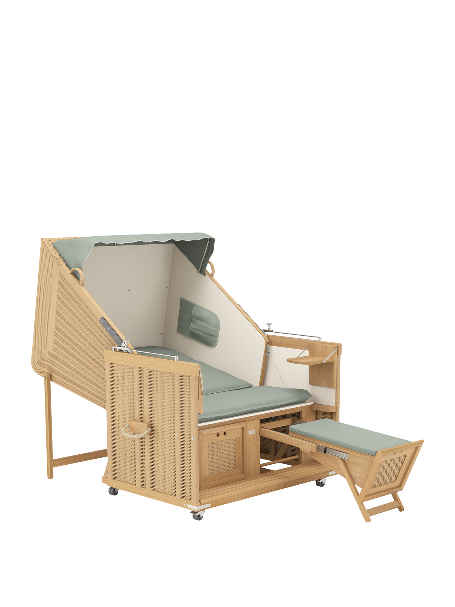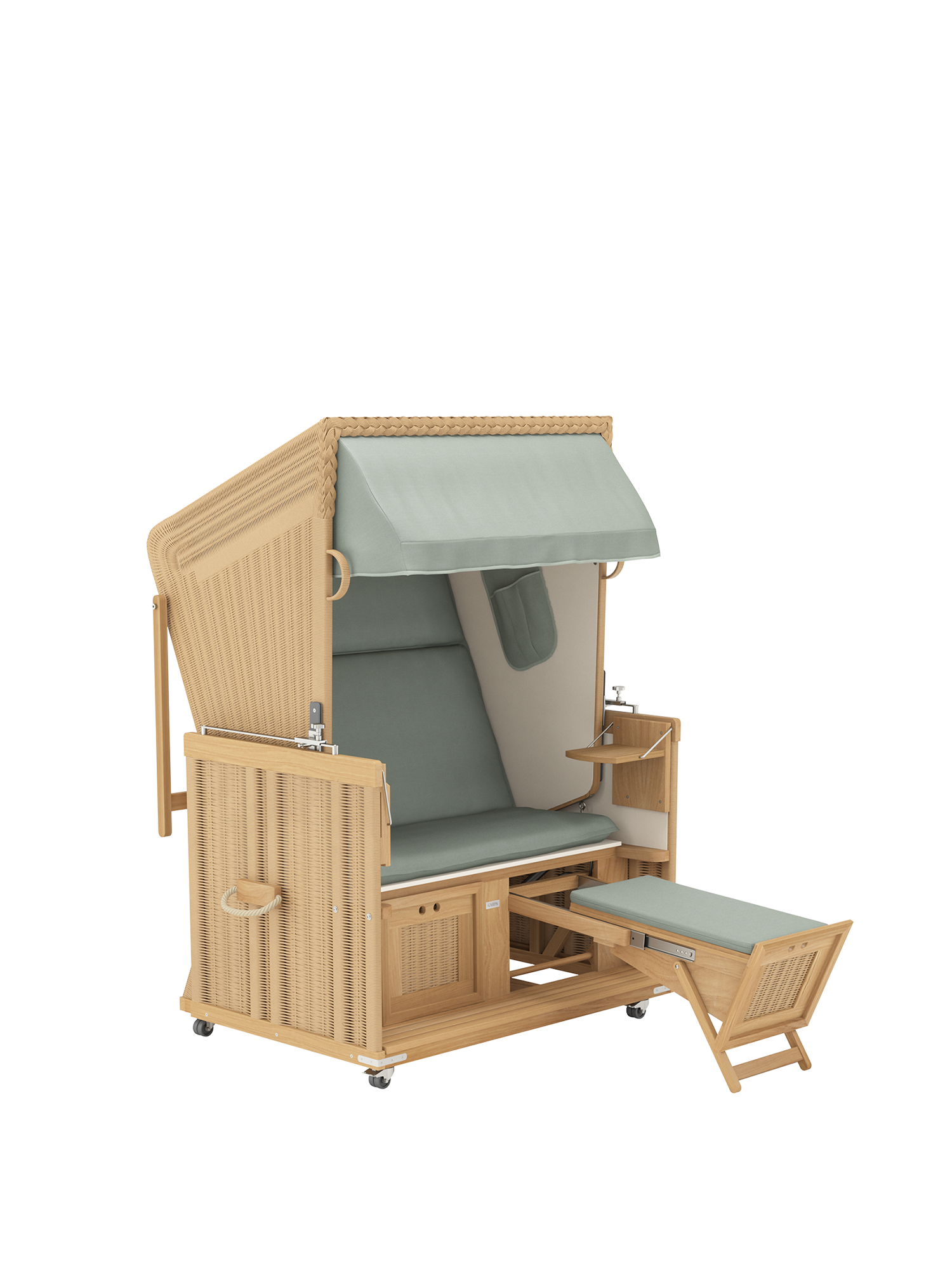 Der Strandkorb besteht aus einem massiven Teakkorpus, der mit einem wetterfesten Kunststoffgeflecht und Edelstahlbeschlägen kombiniert wird. Der elegante Stoff ist unempfindlich und bis auf die Innenauskleidung abnehm- und waschbar.