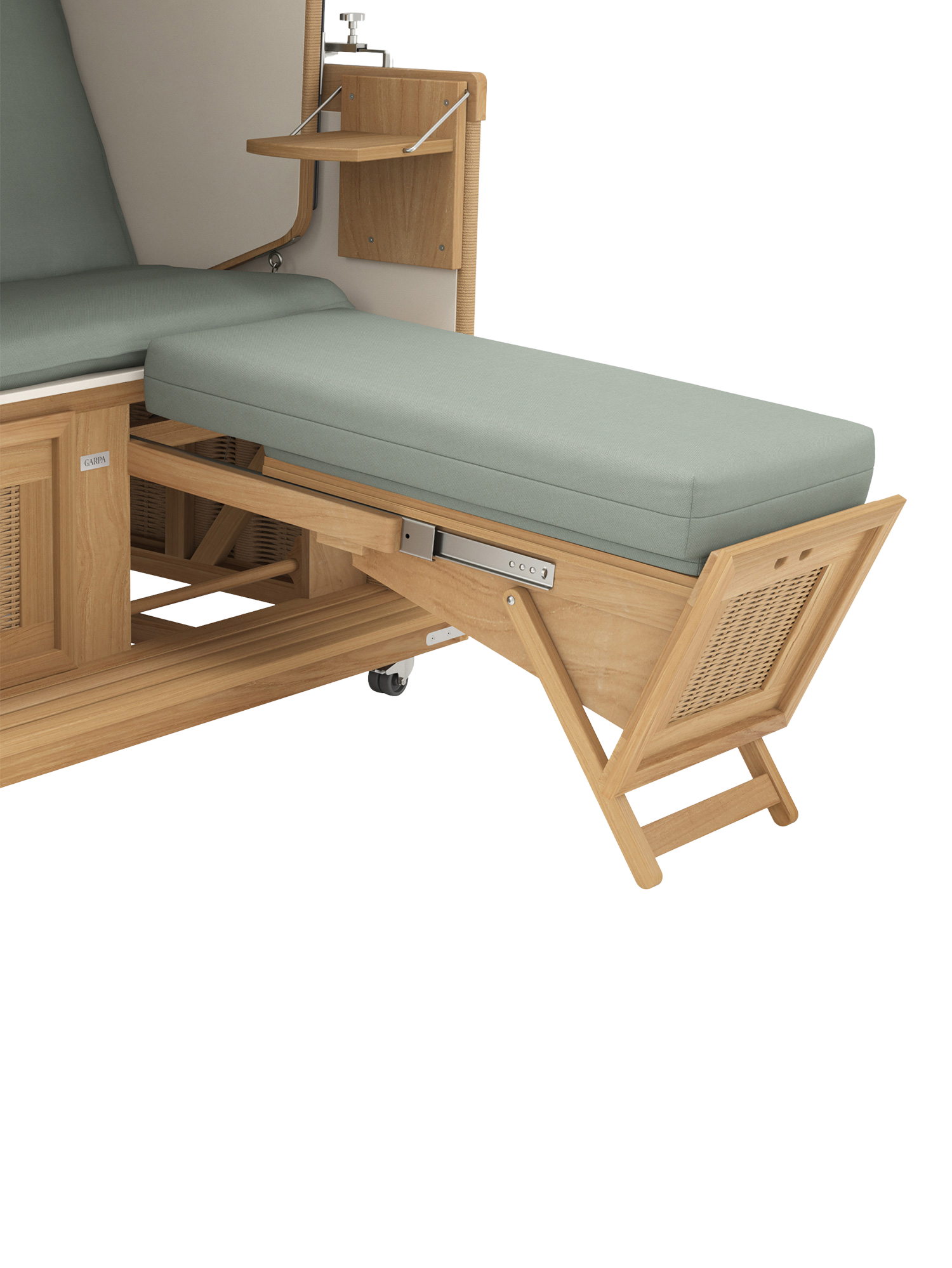 Die Fusskästen gleiten an einem Teleskop-Auszug aus dem Korpus und sind so lang, dass auch grosse Menschen sich bequem ausstrecken können. Sie bieten unsichtbaren Stauraum und können auf Wunsch mit dicken Fusskissen ausgestattet werden.
