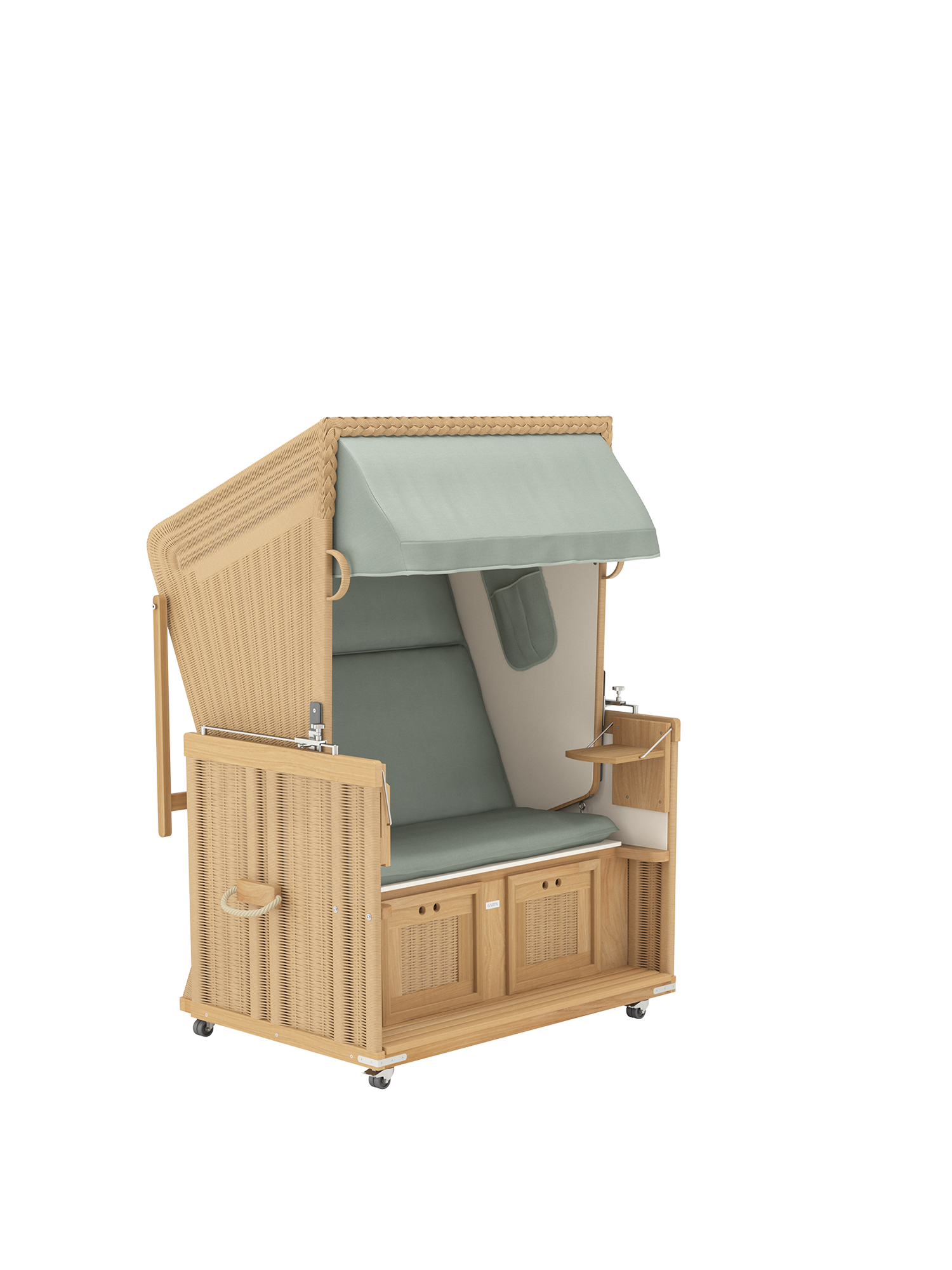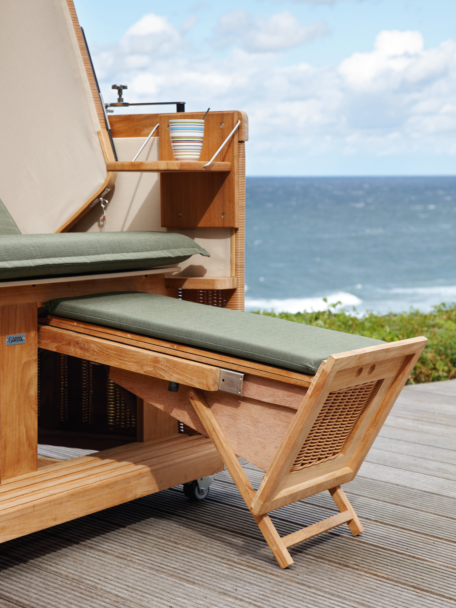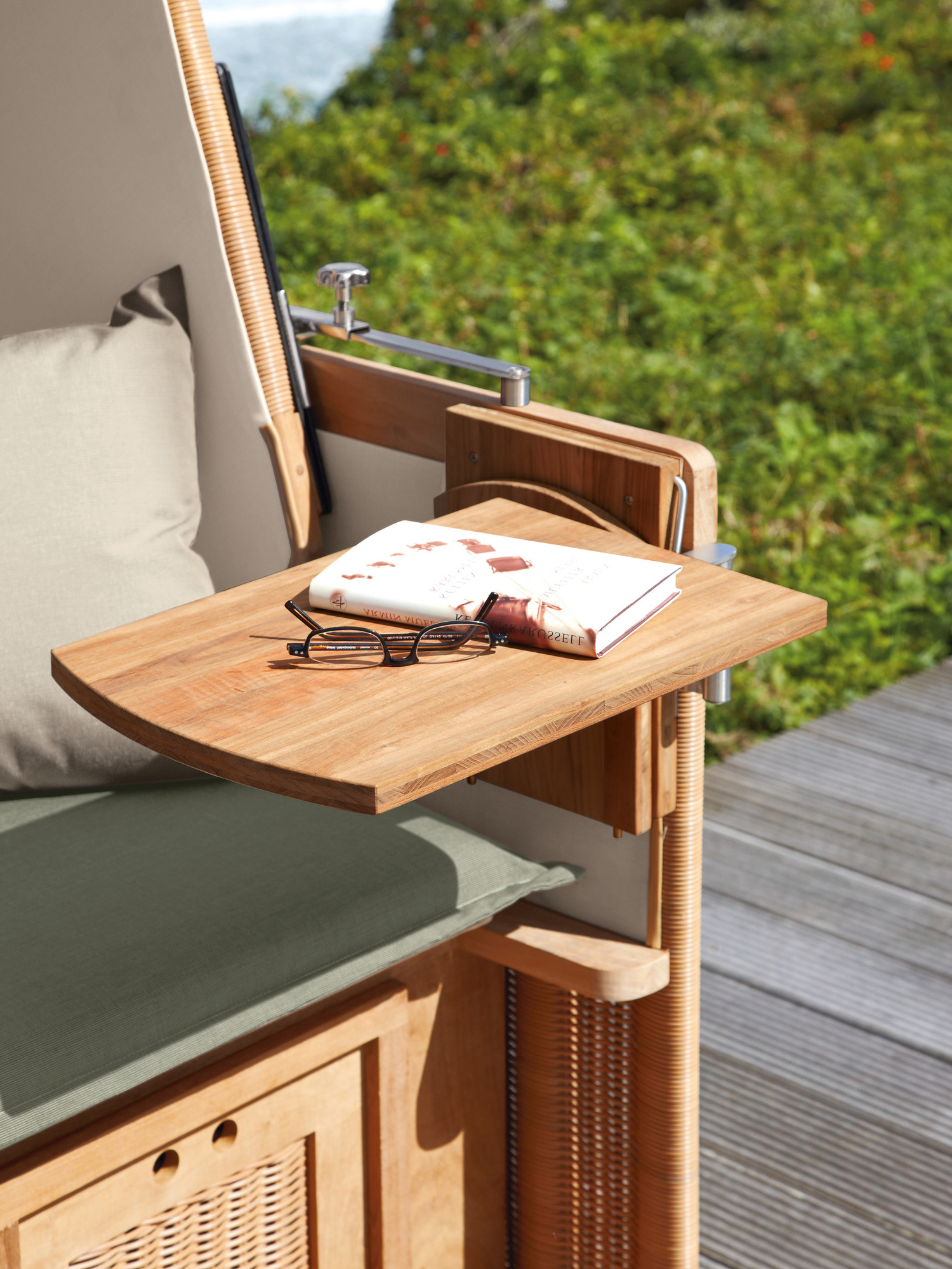 Zum Lieferumfang gehören zwei Teaktabletts und eine Lektüretasche. Räder, die auch festgestellt werden können, machen den Strandkorb beweglich. Zum Schutz vor Nässe wird ausserdem eine Abdeckhaube mitgeliefert.
