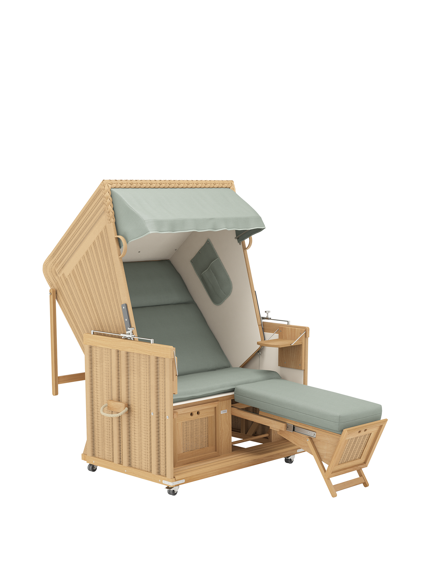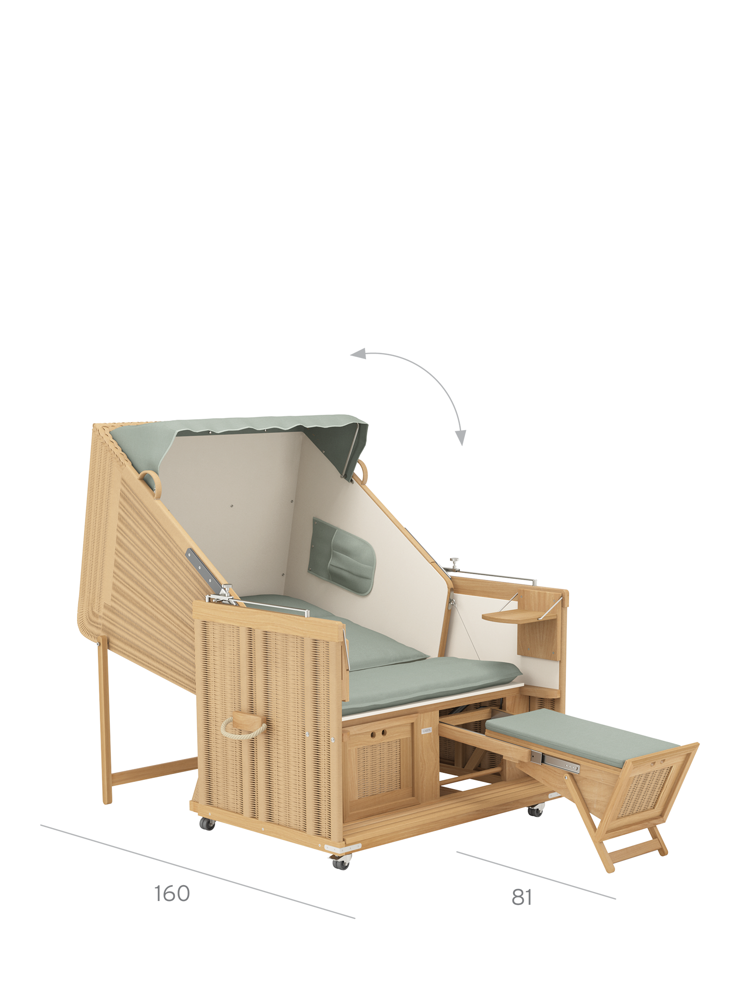 Der geräumige und gepolsterte Sitz des Strandkorbs lässt sich stufenlos zur komplett flachen Doppelliege verstellen. Dank einer Rückholfeder kann der Korb an zwei Griffen leicht wieder aufgerichtet werden.