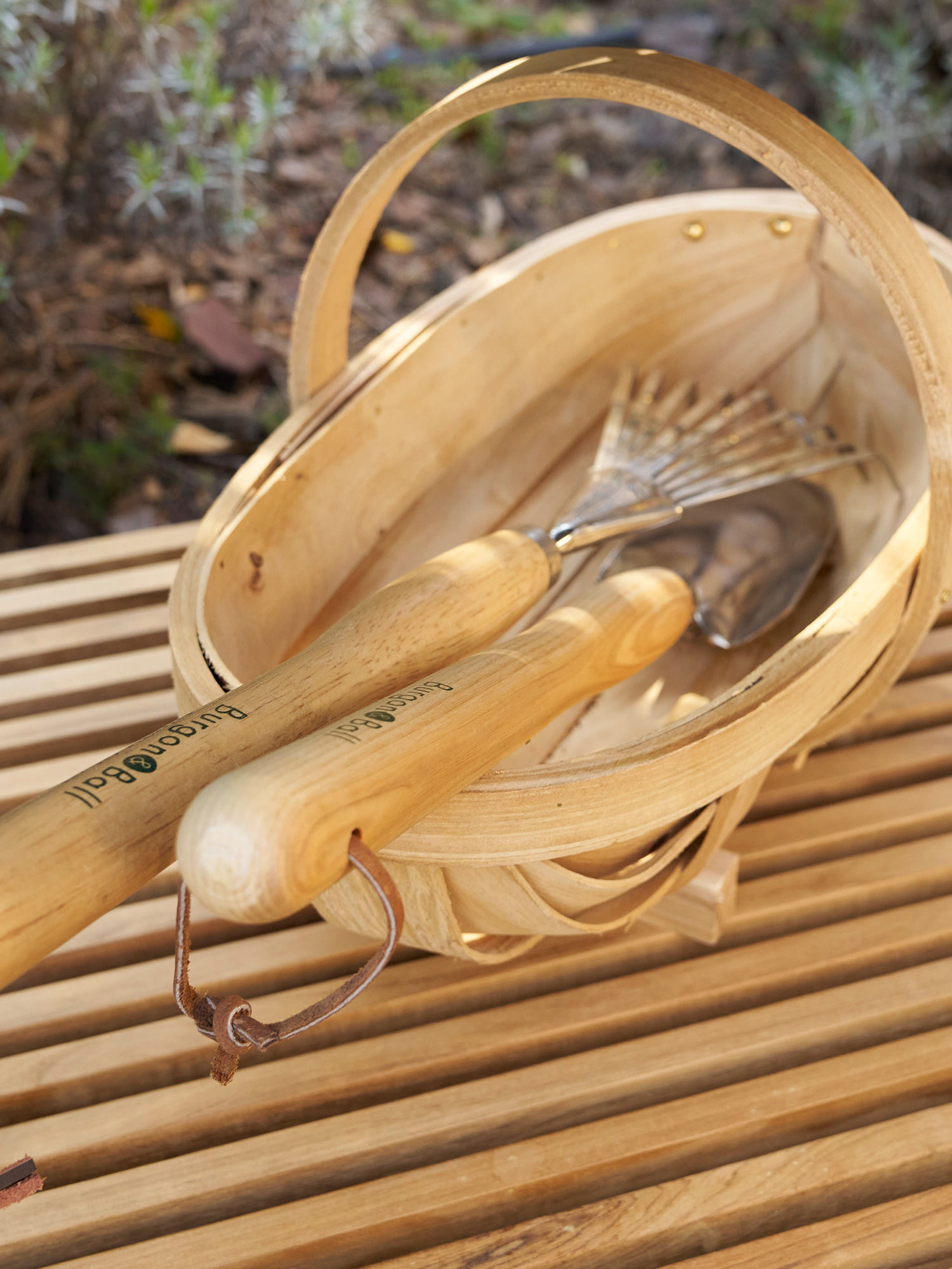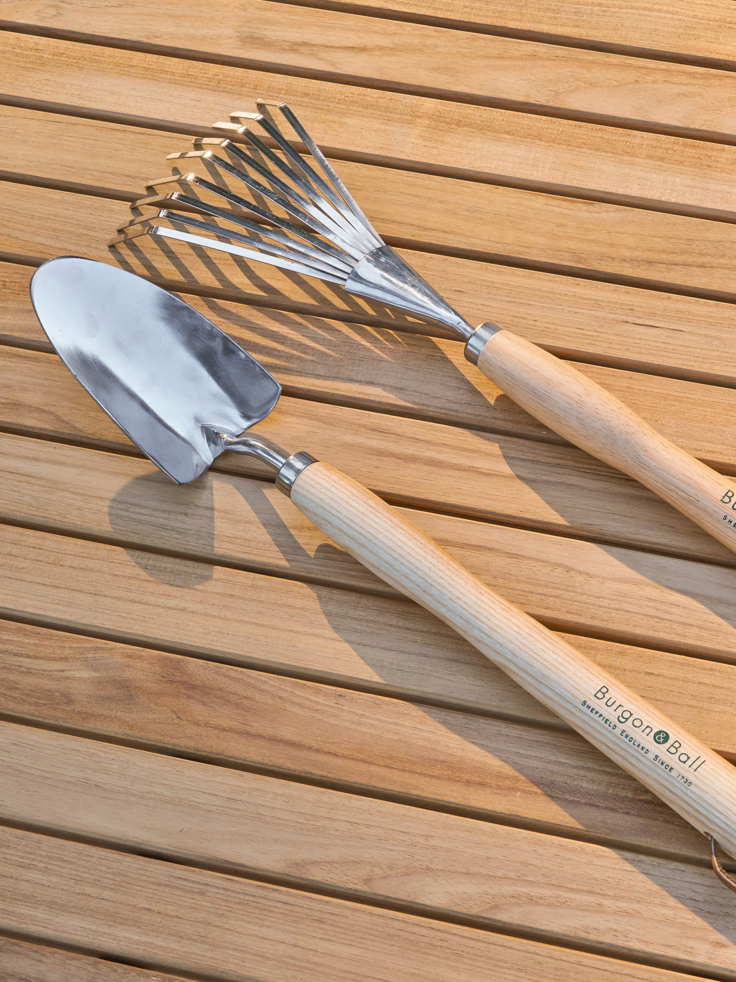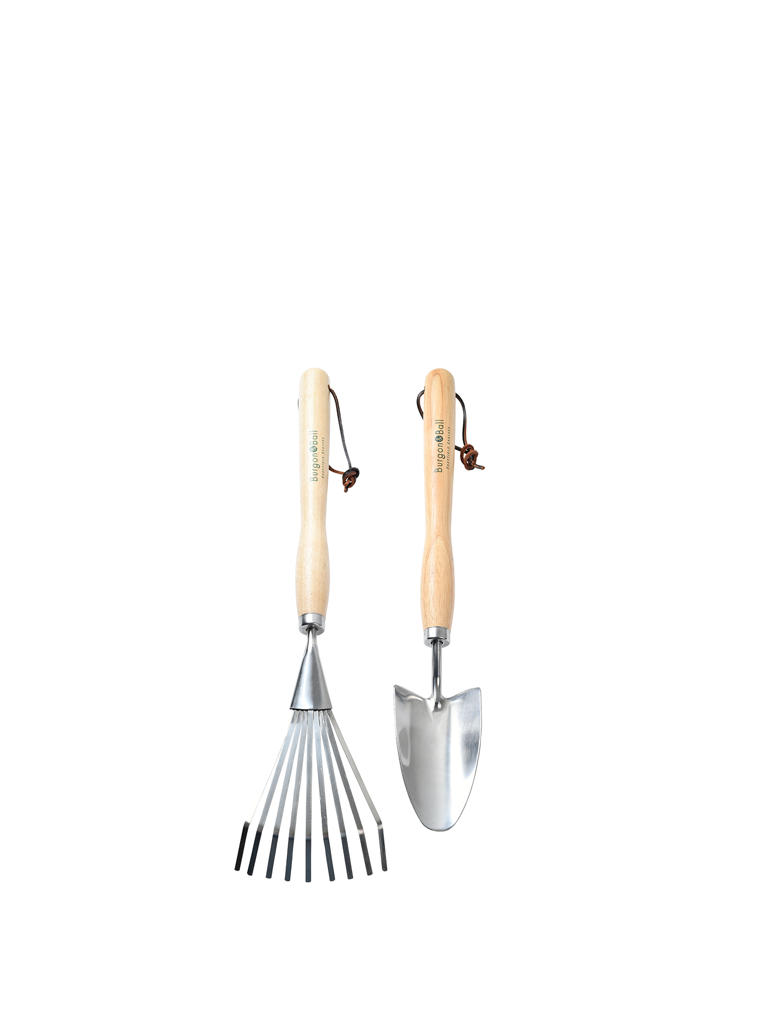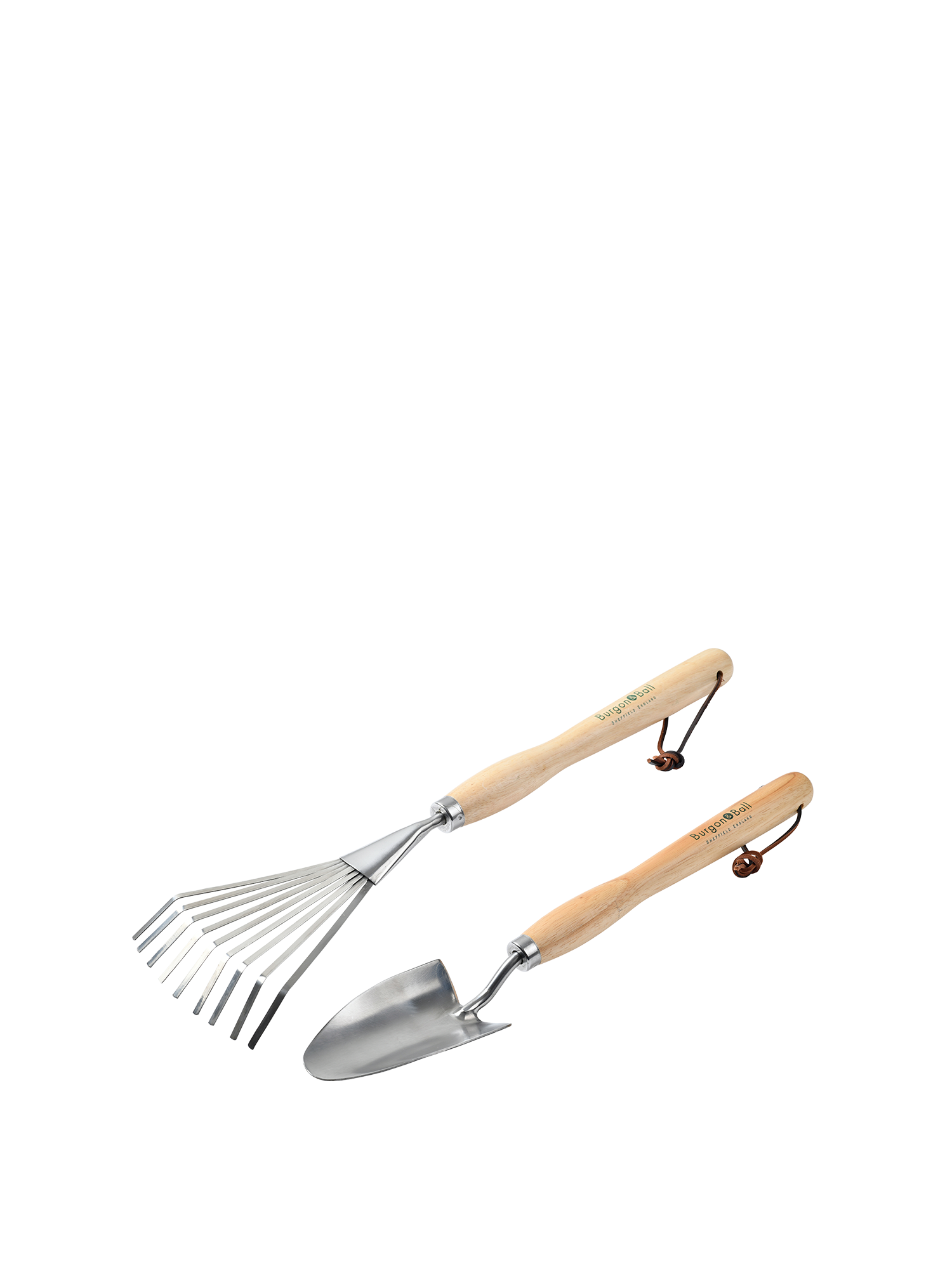 Die aus robustem Edelstahl gefertigte Harke (Breite: 58 cm, Tiefe: 13 cm) hat einen Griff aus FSC-zertifiziertem Buchenholz und Messing. Ihre Spitzen sind nach oben gebogen, um zarte Triebe bei der Gartenarbeit nicht zu verletzen. Die Schaufel (Breite: 48 cm, Tiefe: 7 cm) kombiniert die gleichen Materialien und ist an den Seiten ebenfalls nach oben gebogen, damit die Erde nicht herabfällt. Beide Geräte haben einen verlängerten Griff, der perfekt in der Hand liegt und für Komfort bei der Gartenarbeit sorgt.