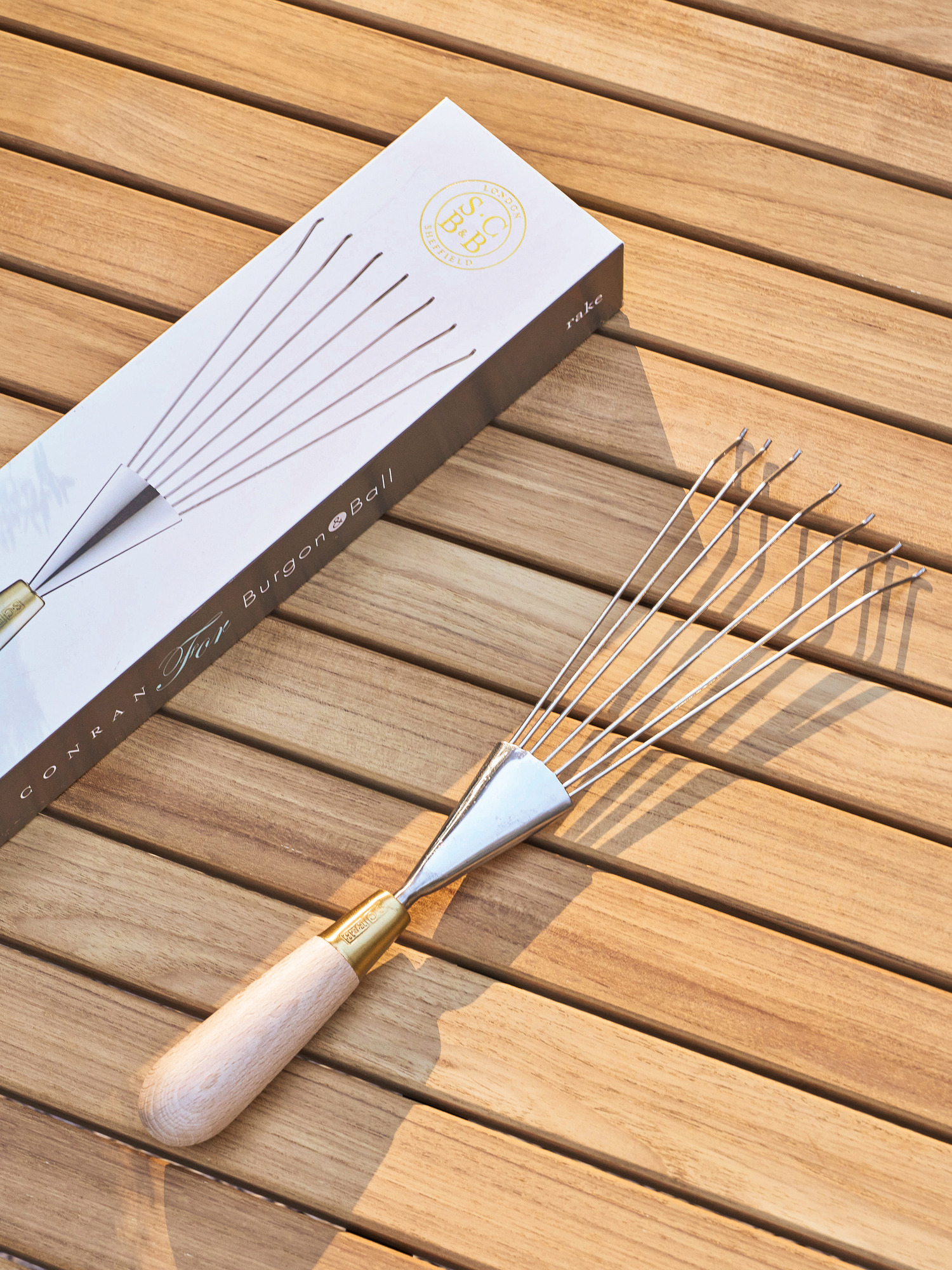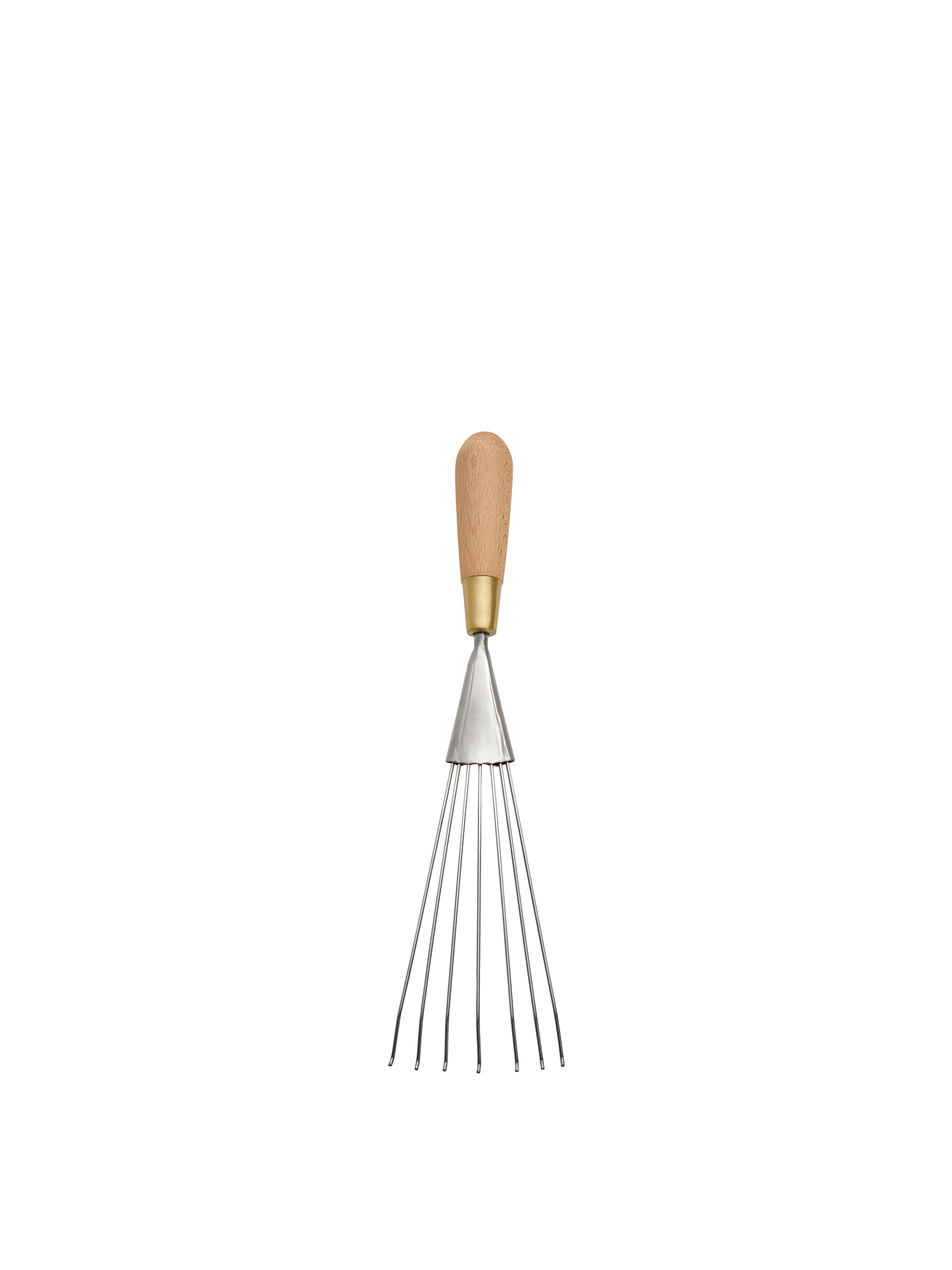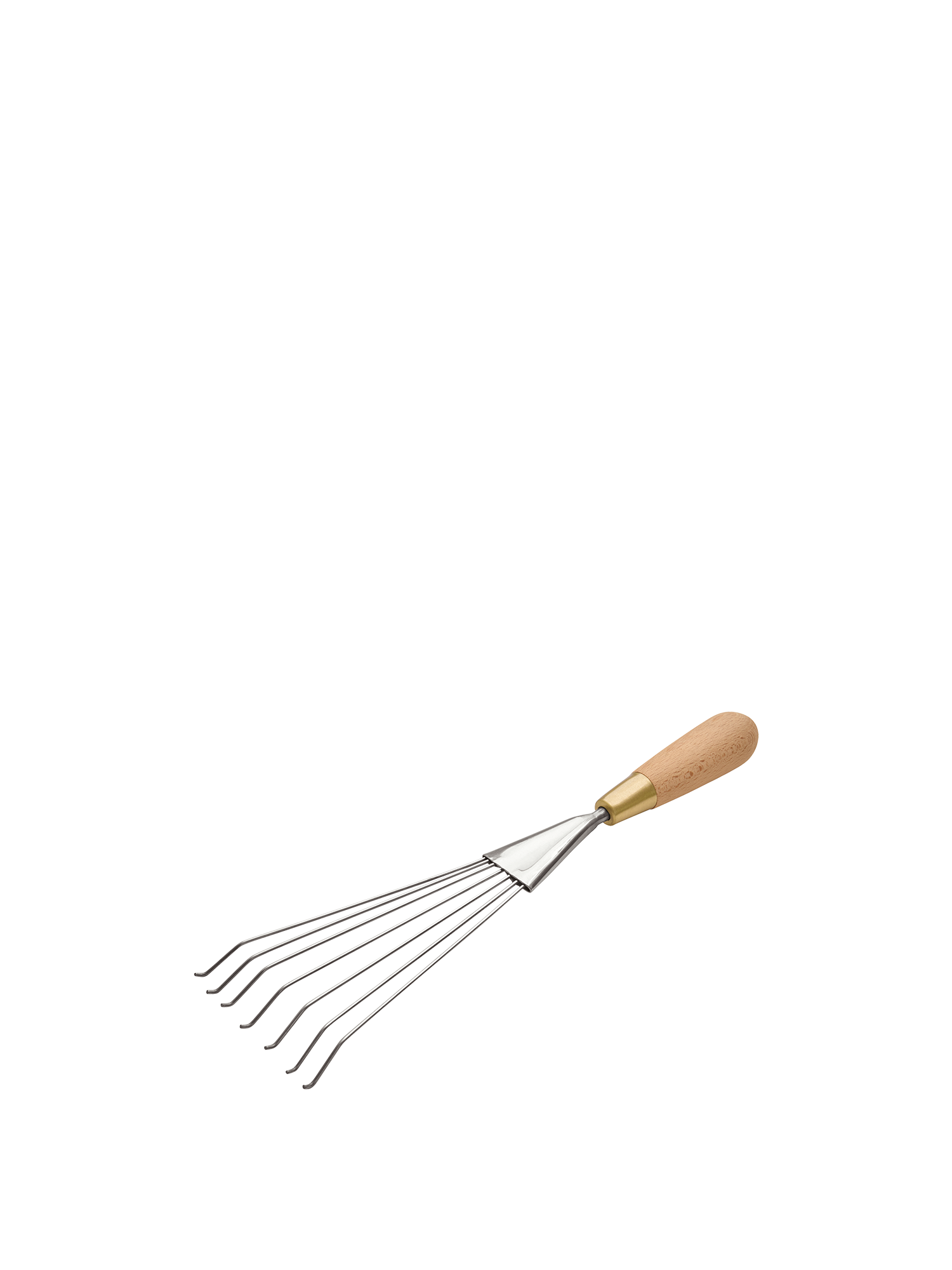 Die aus robustem Edelstahl gefertigte Harke hat einen Griff aus FSC-zertifiziertem Buchenholz und Messing. Ihre Spitzen sind nach oben gebogen, um zarte Triebe bei der Gartenarbeit nicht zu verletzen. Von Vorteil ist die Form auch insofern, als sich das geharkte Laub kaum im Rechen verfängt und mühelos entsorgt werden kann.