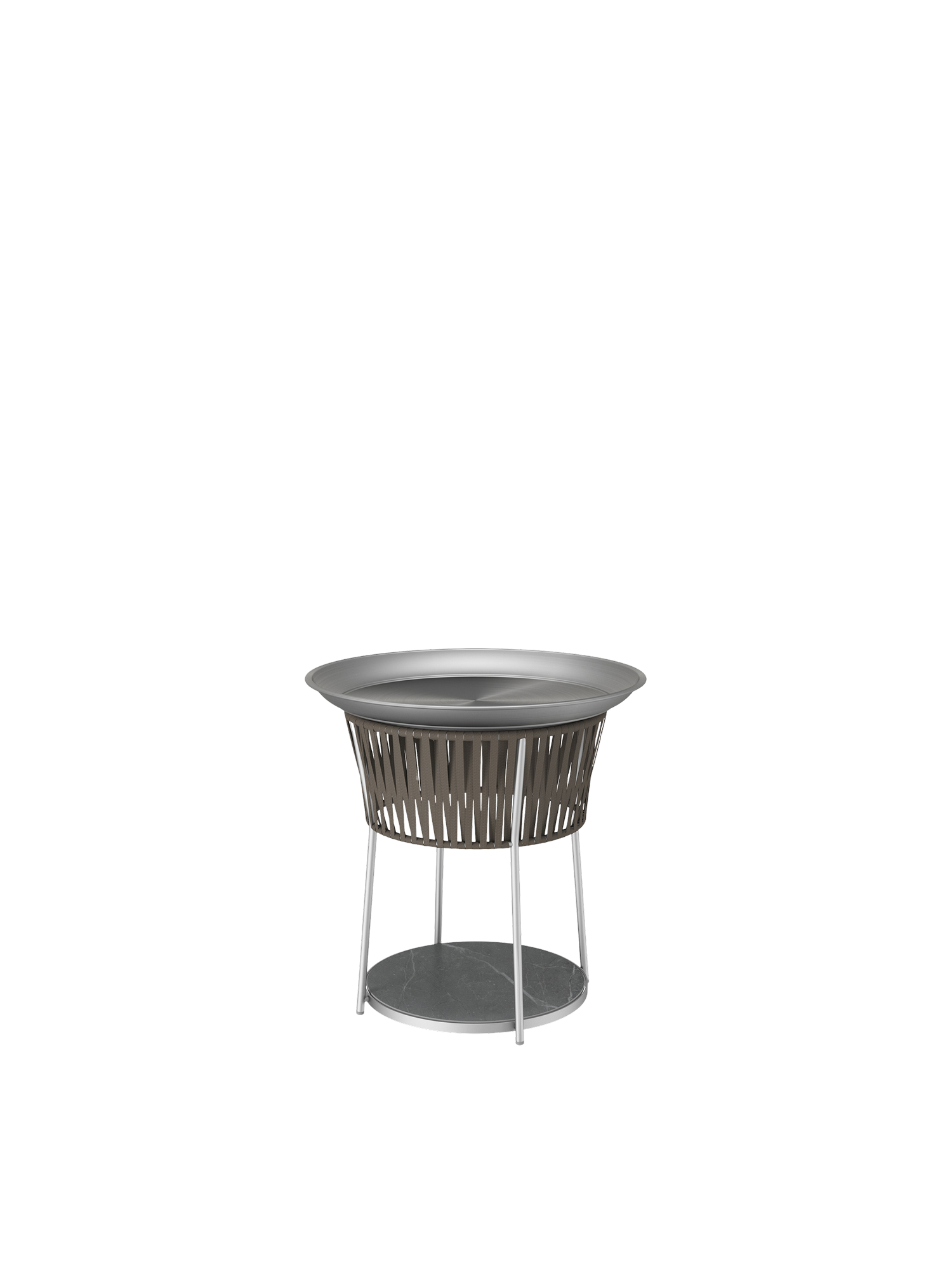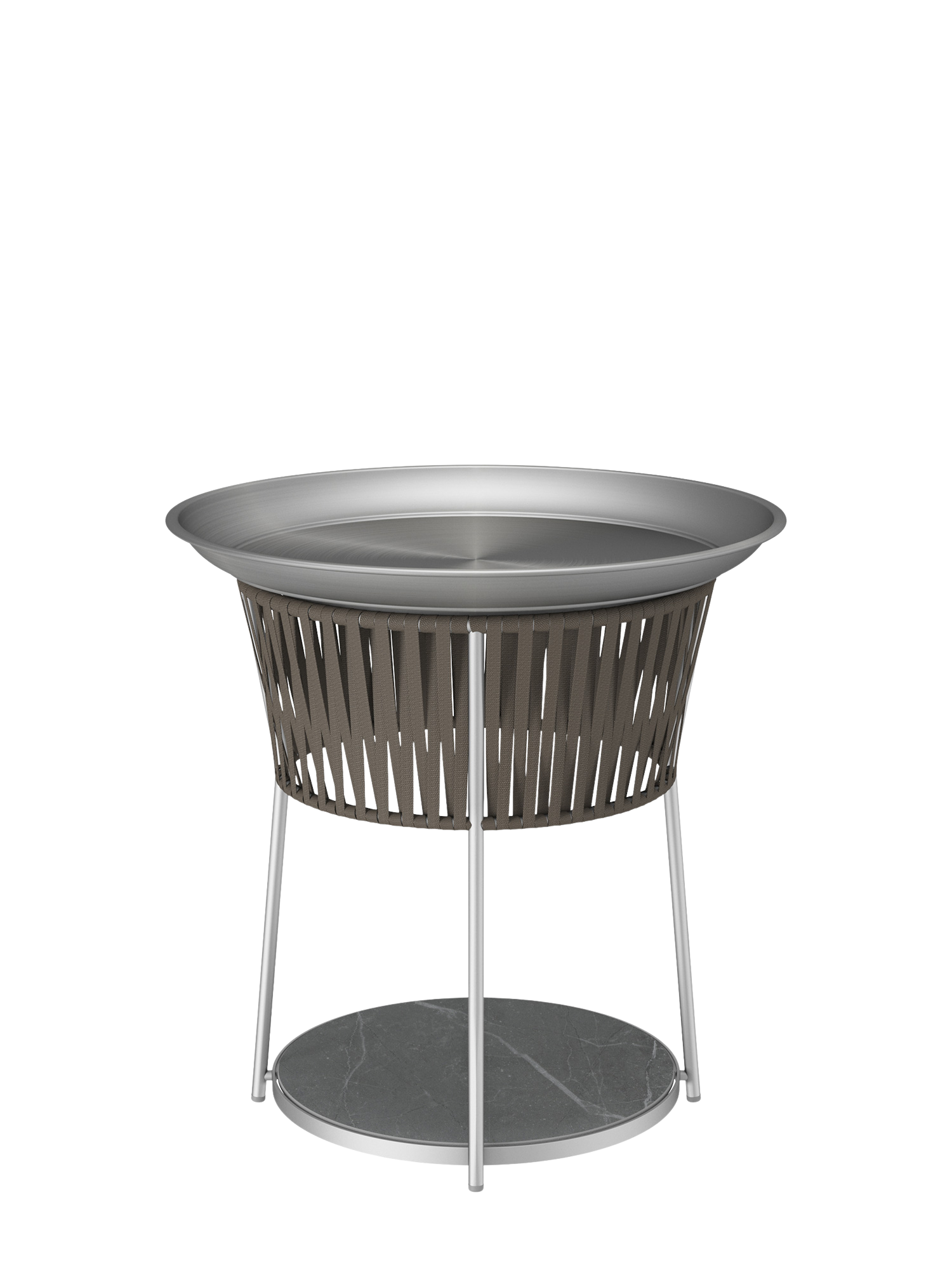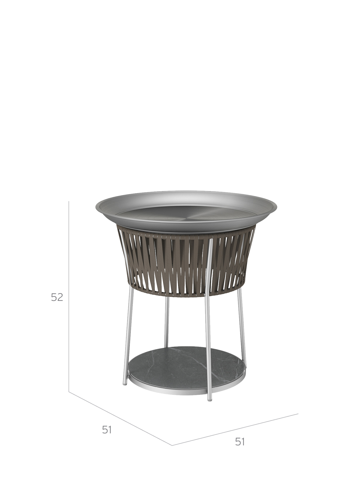 Umflochten mit der stilprägenden Kordel der Temper Serie aus schnelltrocknendem Polypropylen in Petrol oder Braun ist der filigrane Beistelltisch aus eloxiertem Aluminium, der ein abnehmbares Tablett aus mattiertem Edelstahl trägt. Er ist wahlweise mit einem Boden aus Steinkeramik oder Glas erhältlich.