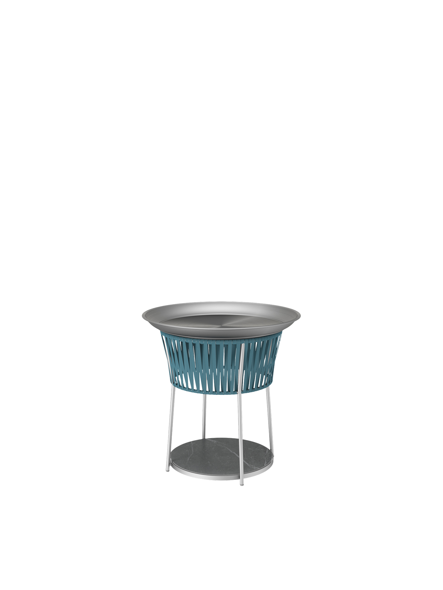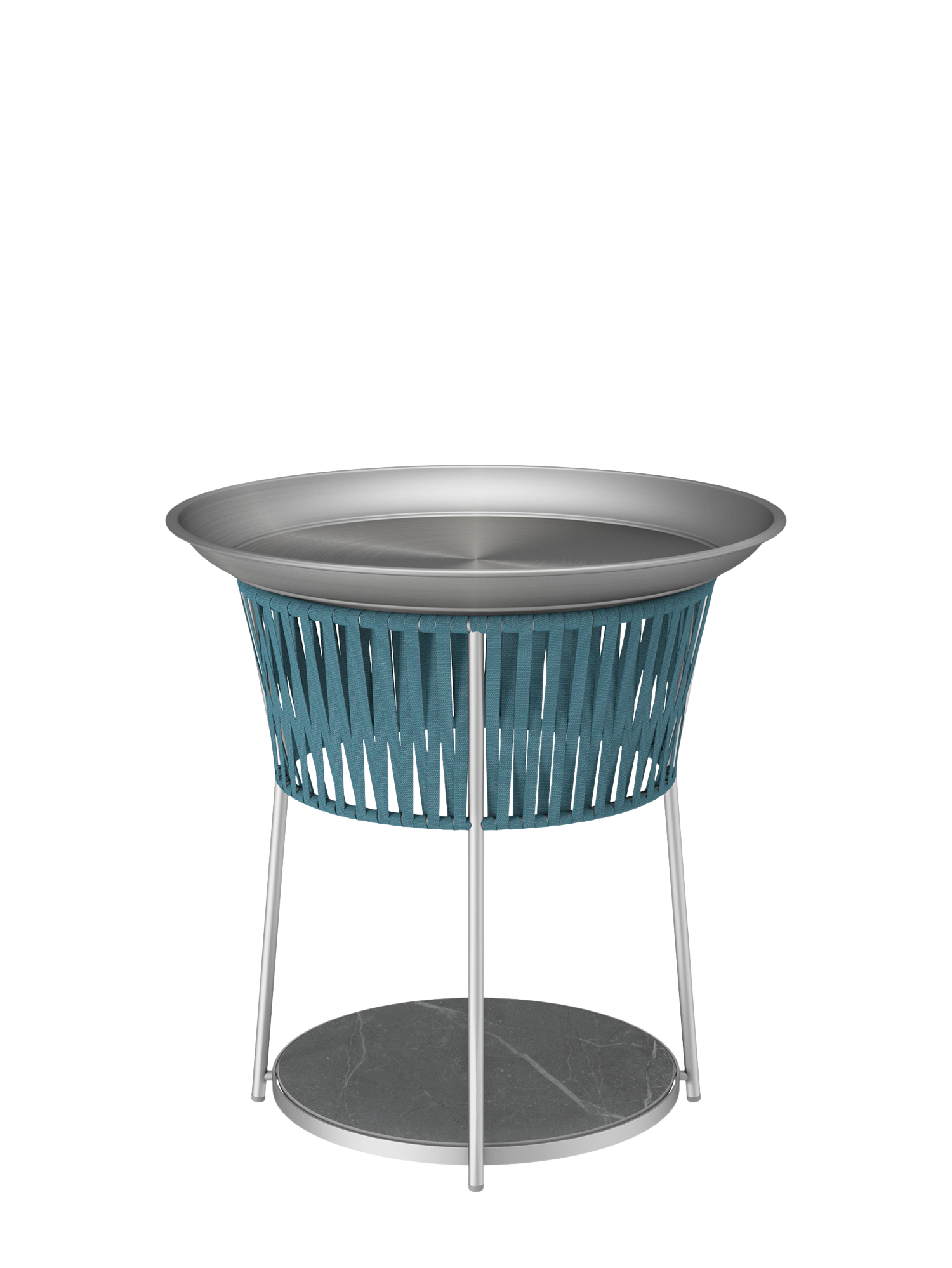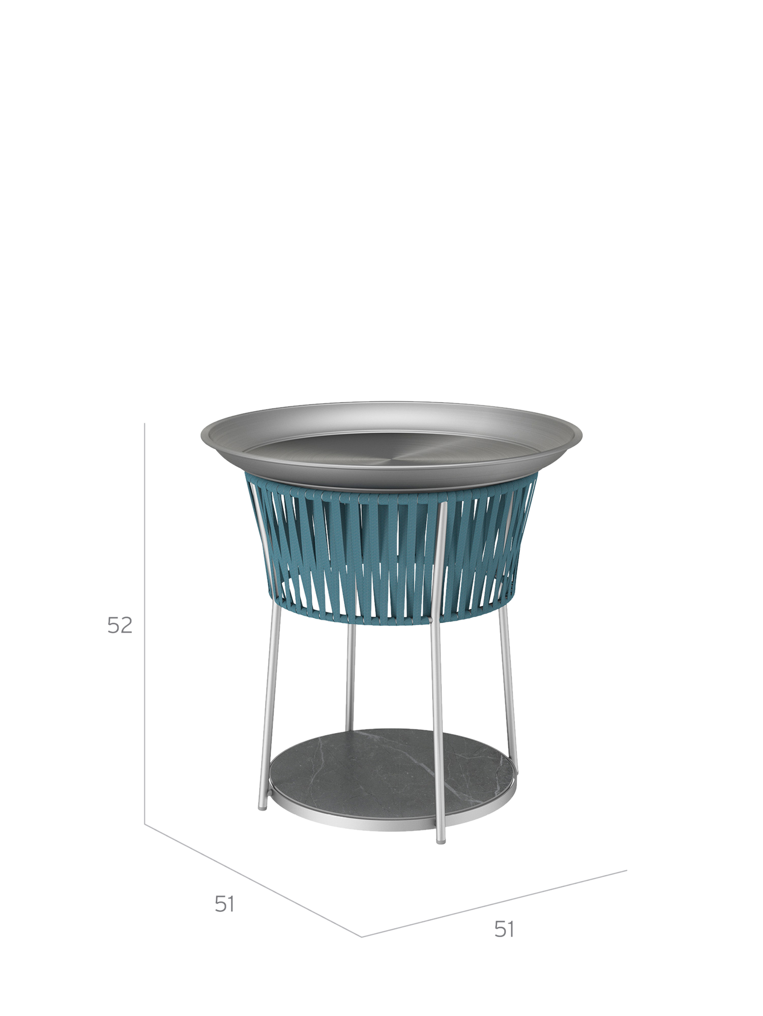 Umflochten mit der stilprägenden Kordel der Temper Serie aus schnelltrocknendem Polypropylen in Petrol oder Braun ist der filigrane Beistelltisch aus eloxiertem Aluminium, der ein abnehmbares Tablett aus mattiertem Edelstahl trägt. Er ist wahlweise mit einem Boden aus Steinkeramik oder Glas erhältlich.