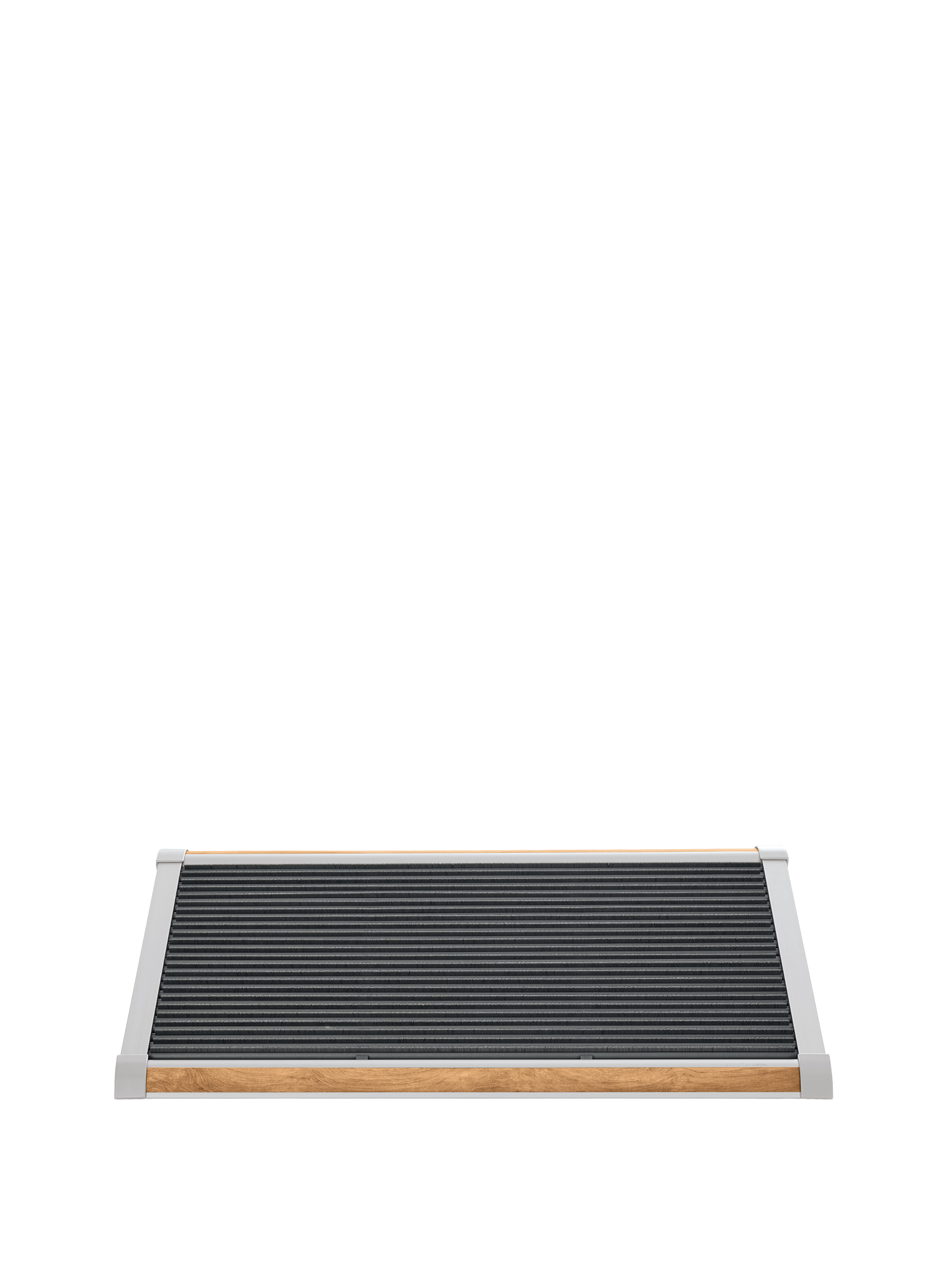 Der Aluminiumrahmen der praktischen Terrassenmatte im Format 90 x 60 cm erhält durch schmale Teakleisten eine wohnliche Note. Viele kleine Bürsten sorgen für Sauberkeit unter den Sohlen.