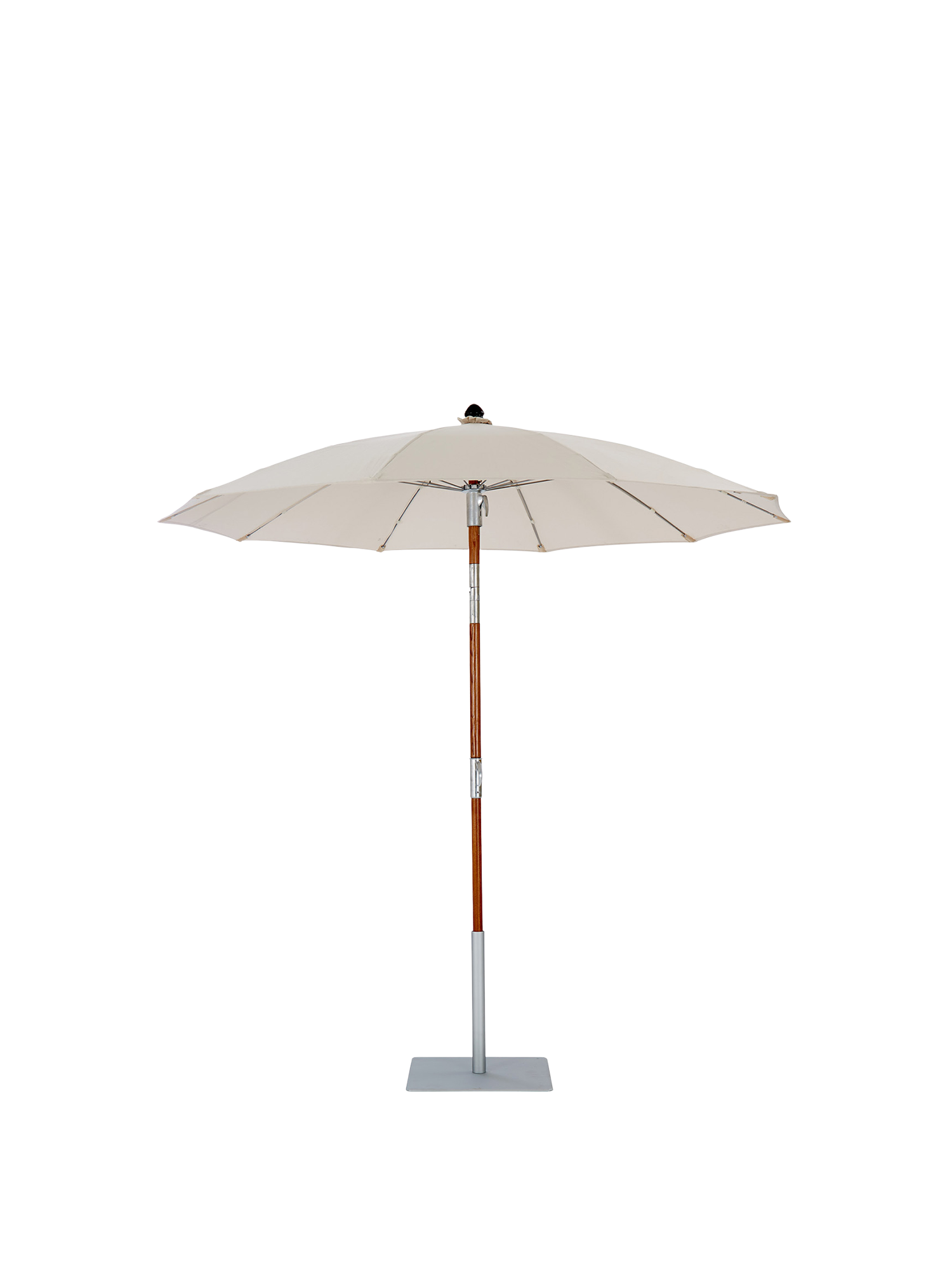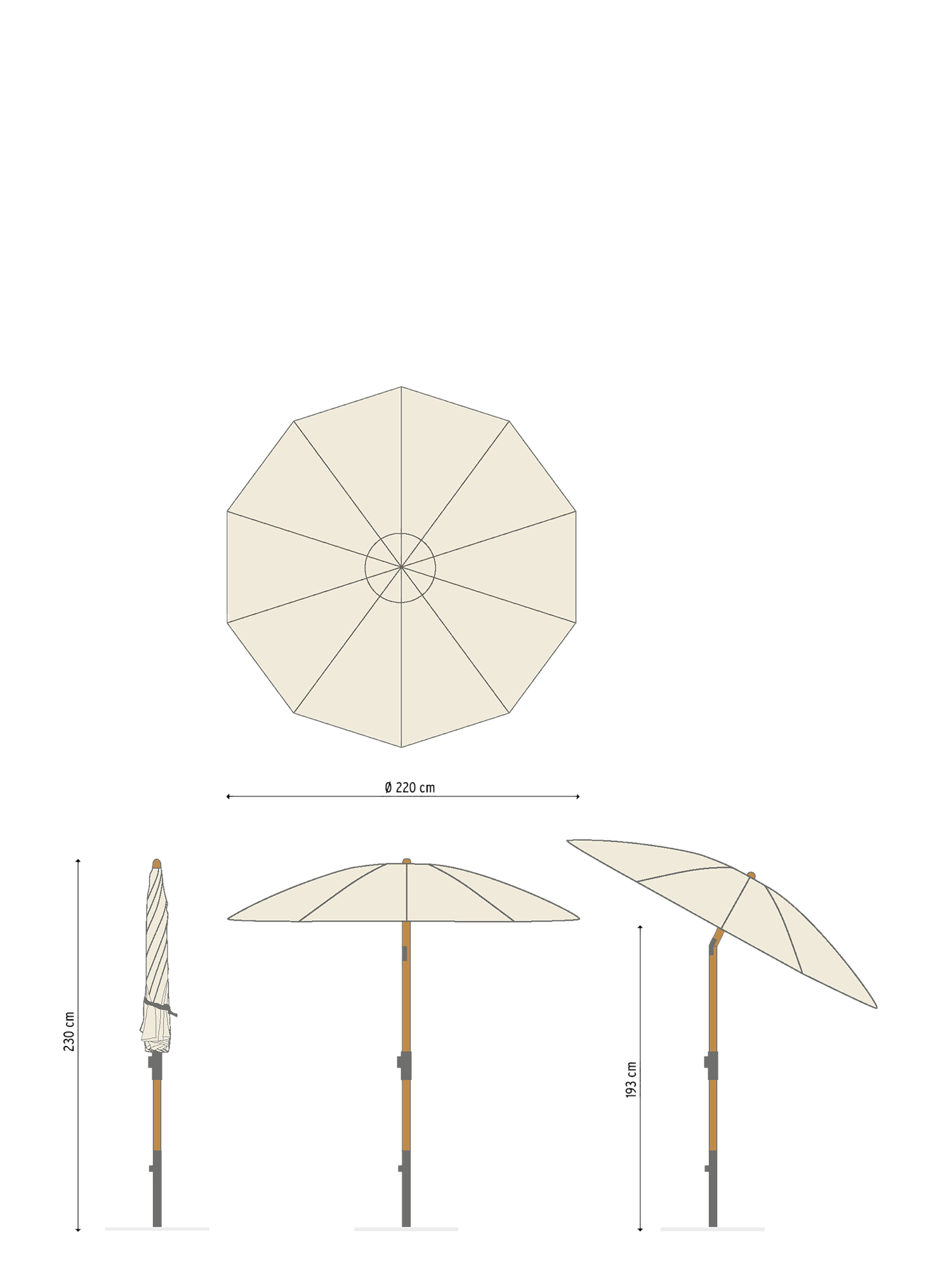 Der runde Schirm hat einen Durchmesser von 220 cm und eignet sich besonders für den Einsatz auf dem Balkon oder als Begleiter zur Liege. Für diesen Schirm ist ein spezieller Balkonschirmständer erhältlich, dessen rechteckiger Fuss direkt an die Balkonbrüstung gestellt werden kann.