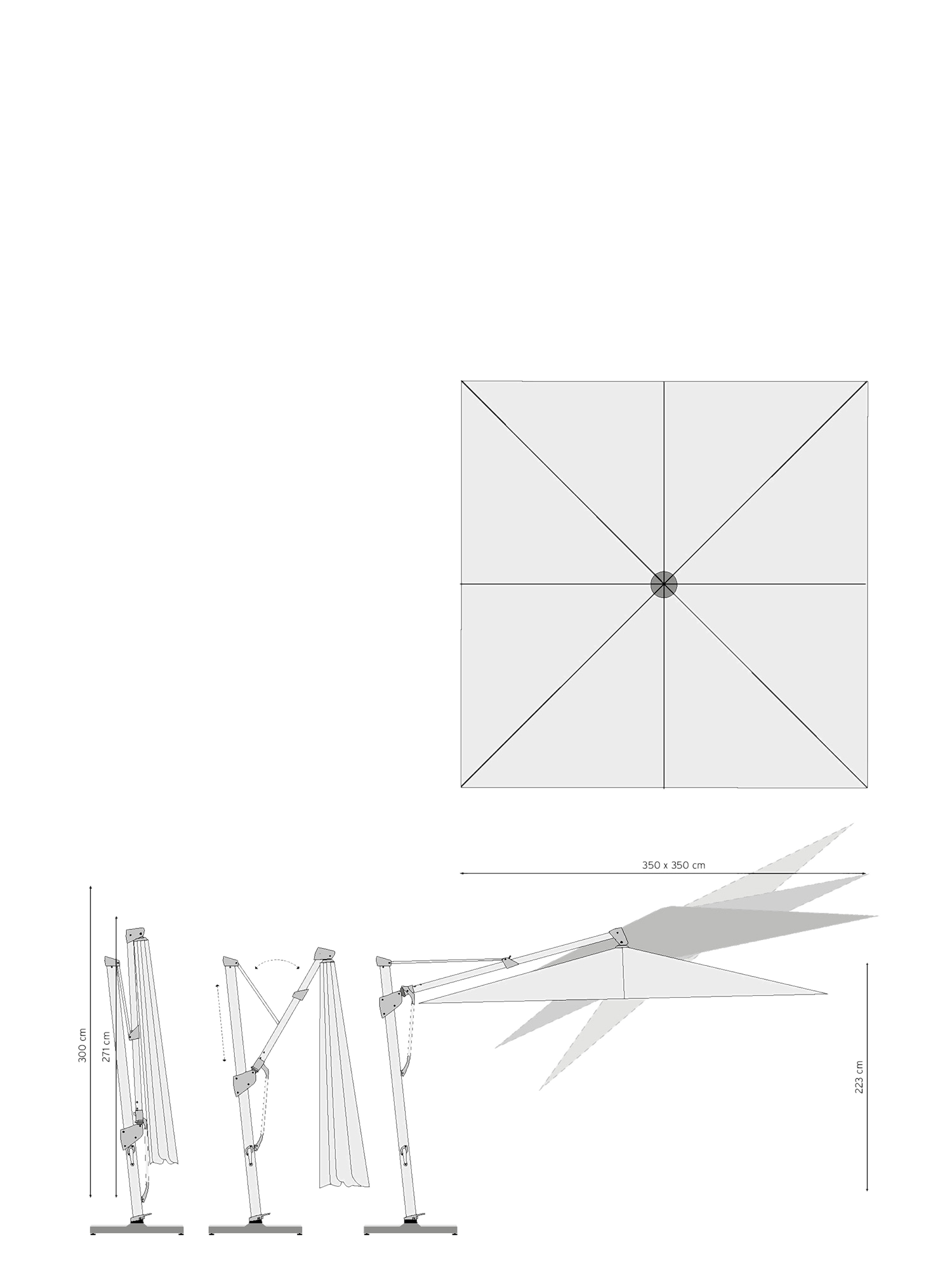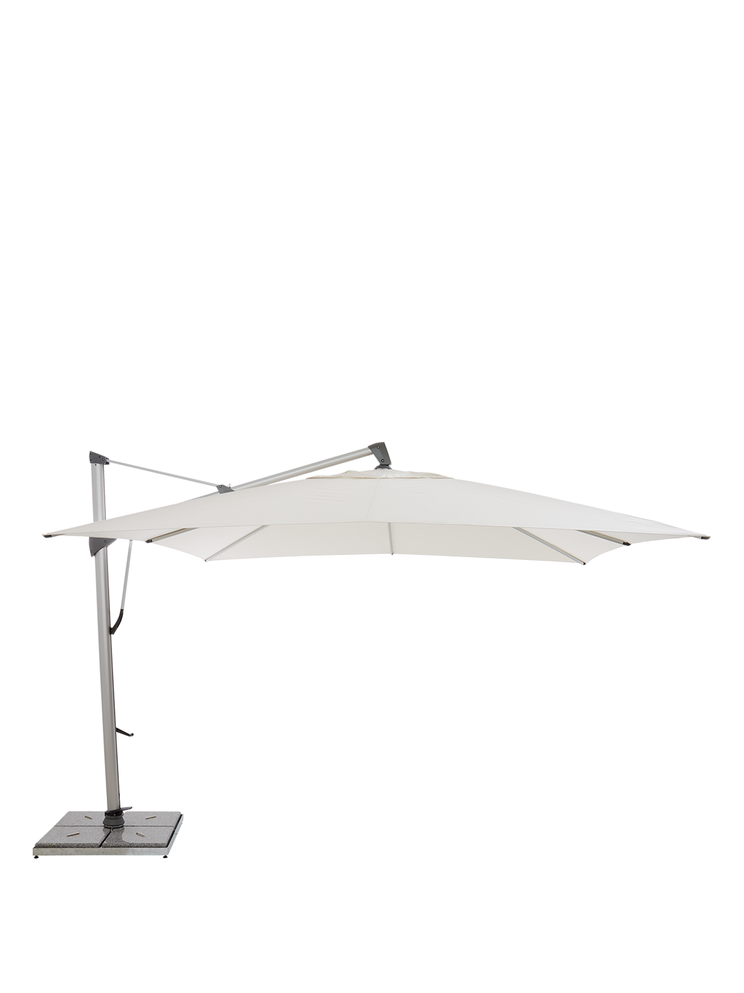 Optimaler Schutz, ganz unabhängig vom Sonnenstand: Der flexible Pendelschirm lässt sich vertikal um bis zu 90 Grad neigen und in drei festgelegten Positionen arretieren. Der quadratische Schirmständer, der mit polierten Granitplatten beschwert ist, sorgt für festen Stand.