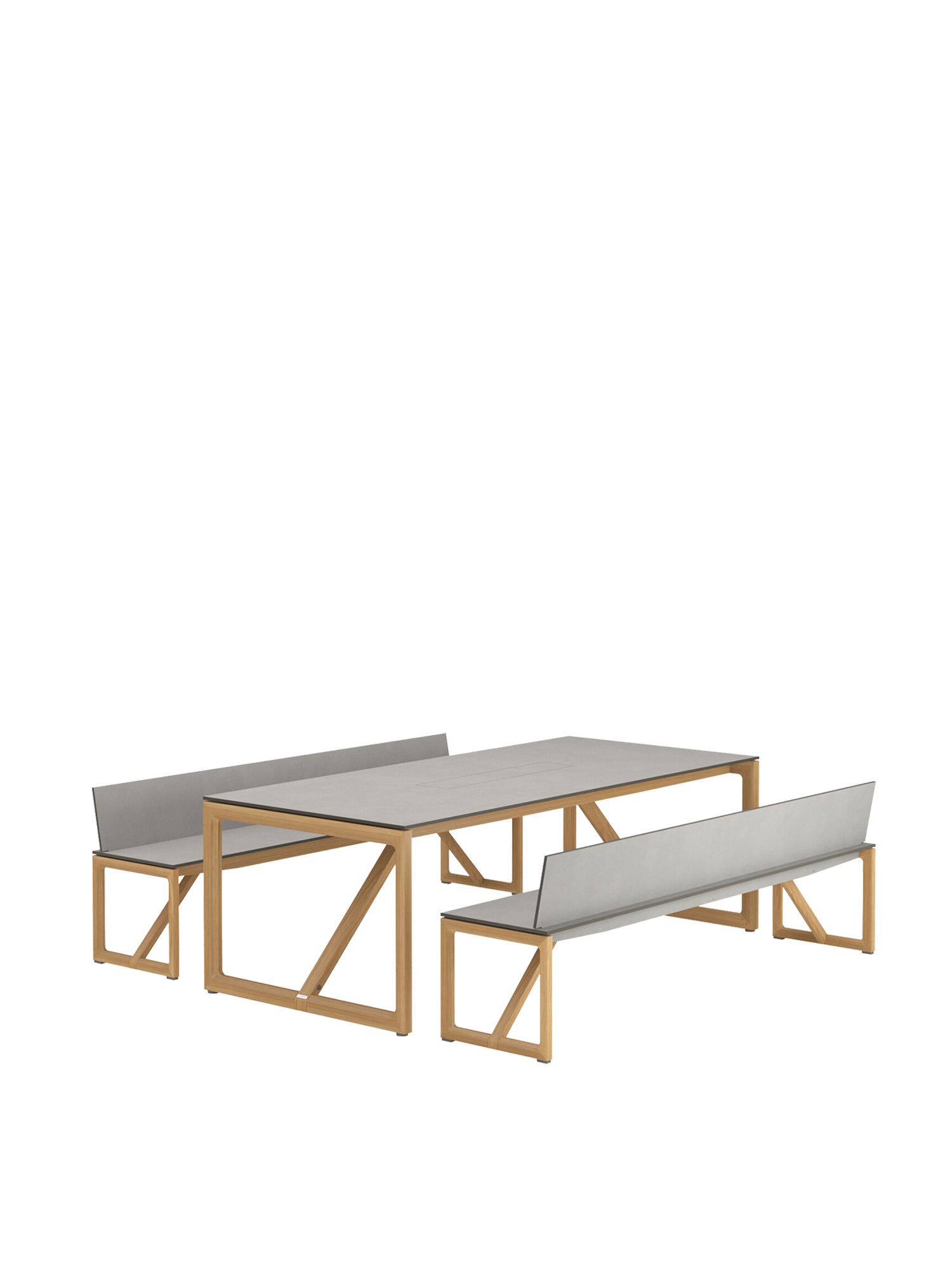 Triumphales Trio: Sichern Sie sich die aus einem Tisch und zwei Bänken bestehende Trey Sitzgruppe als exklusives Set.