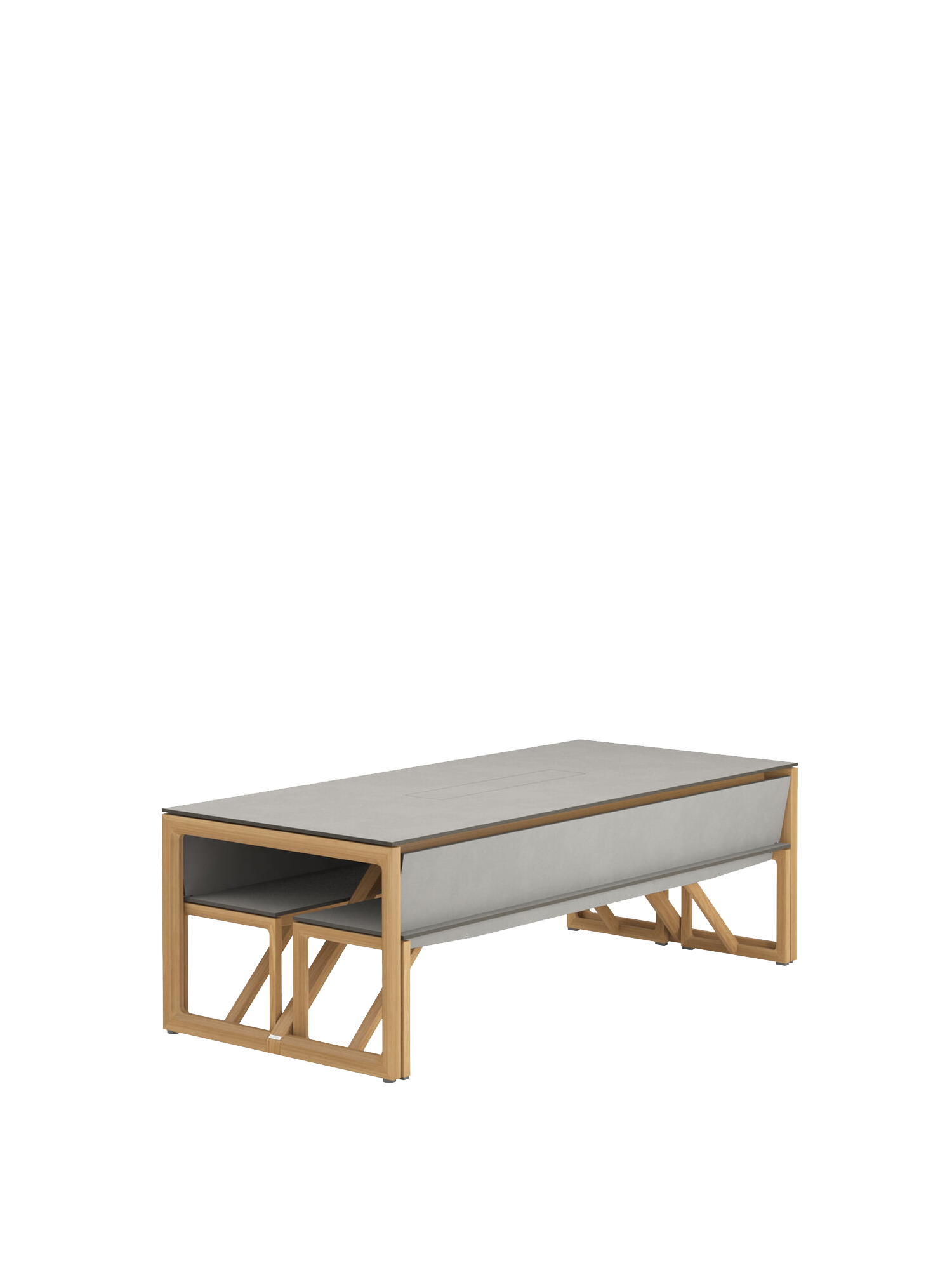 Die Bänke gleichen in ihrer Konstruktion aus Teakholzrahmen und Kunstharzplatten dem Tisch. Nach geselligen Abenden oder bei Dauerregen können sie in voller Länge unter ihm verschwinden und bilden gemeinsam eine kompakte Quaderform. Mittig des Tisches befindet sich ein verschliessbarer Edelstahlbehälter mit Ablaufschlitzen, in dem Kräuter, Flaschen oder Tischsets aufbewahrt werden können. Für Eiswürfel empfehlen wir den geschlossenen Behälter (844934).