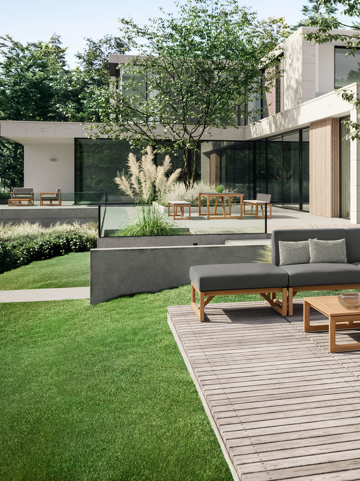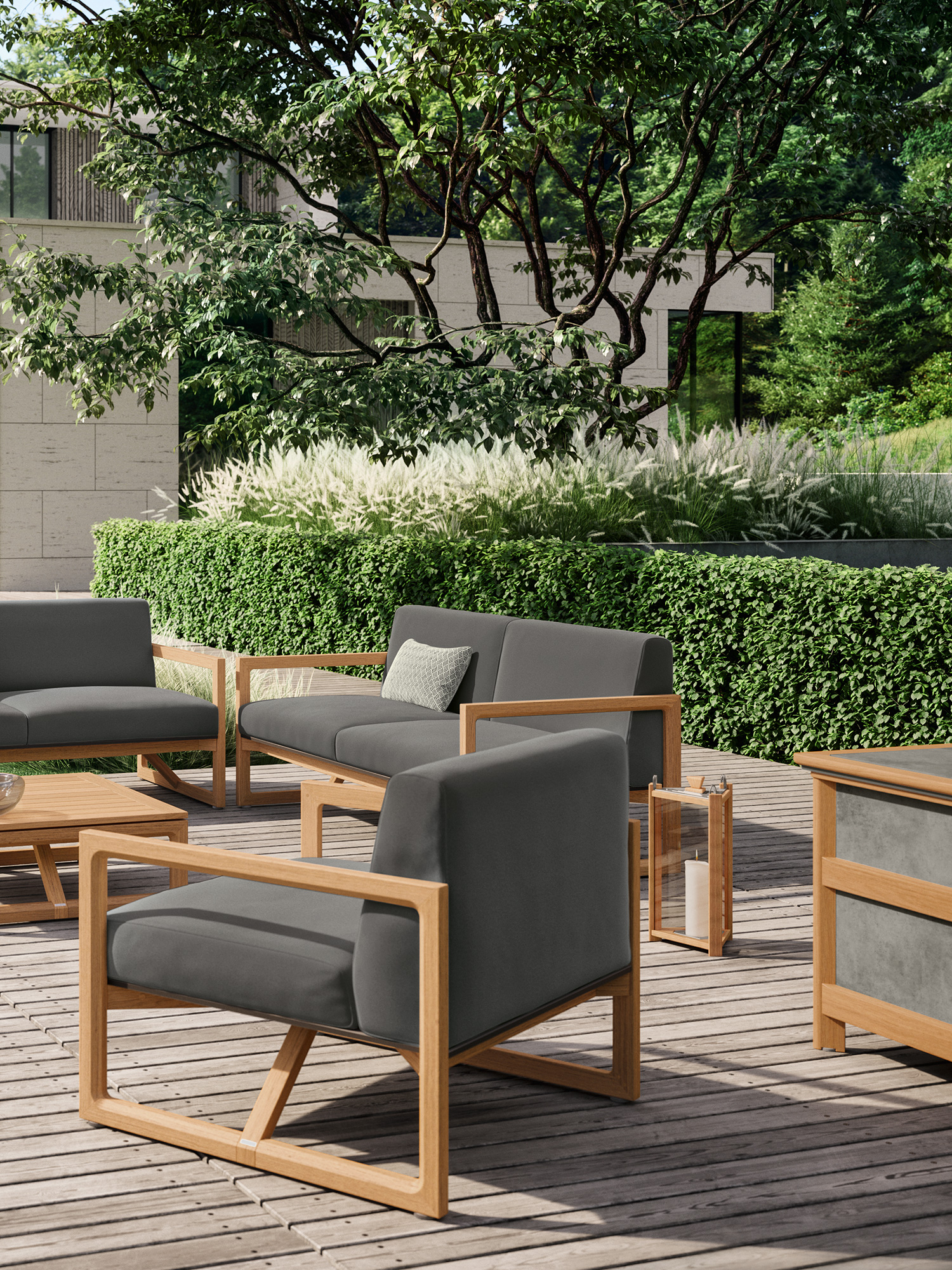 Ein markantes Teakgestell rahmt opulente Polster, die für optimale Stabilität fest miteinander verbunden sind und pure Behaglichkeit versprechen. Das einladende Sofa empfiehlt sich als Solitär und kann ebenso gut mit den anderen Polstermöbeln der Kollektion kombiniert werden. Das puristische Design verbindet das Sofa mit der Trey Sitzgruppe. Gemeinsam laden die zeitlosen Dining- und Loungemöbel zur ganzheitlichen Einrichtung von Gärten und Terrassen ein. Für Komfort, dem einfach nichts hinzuzufügen ist.
