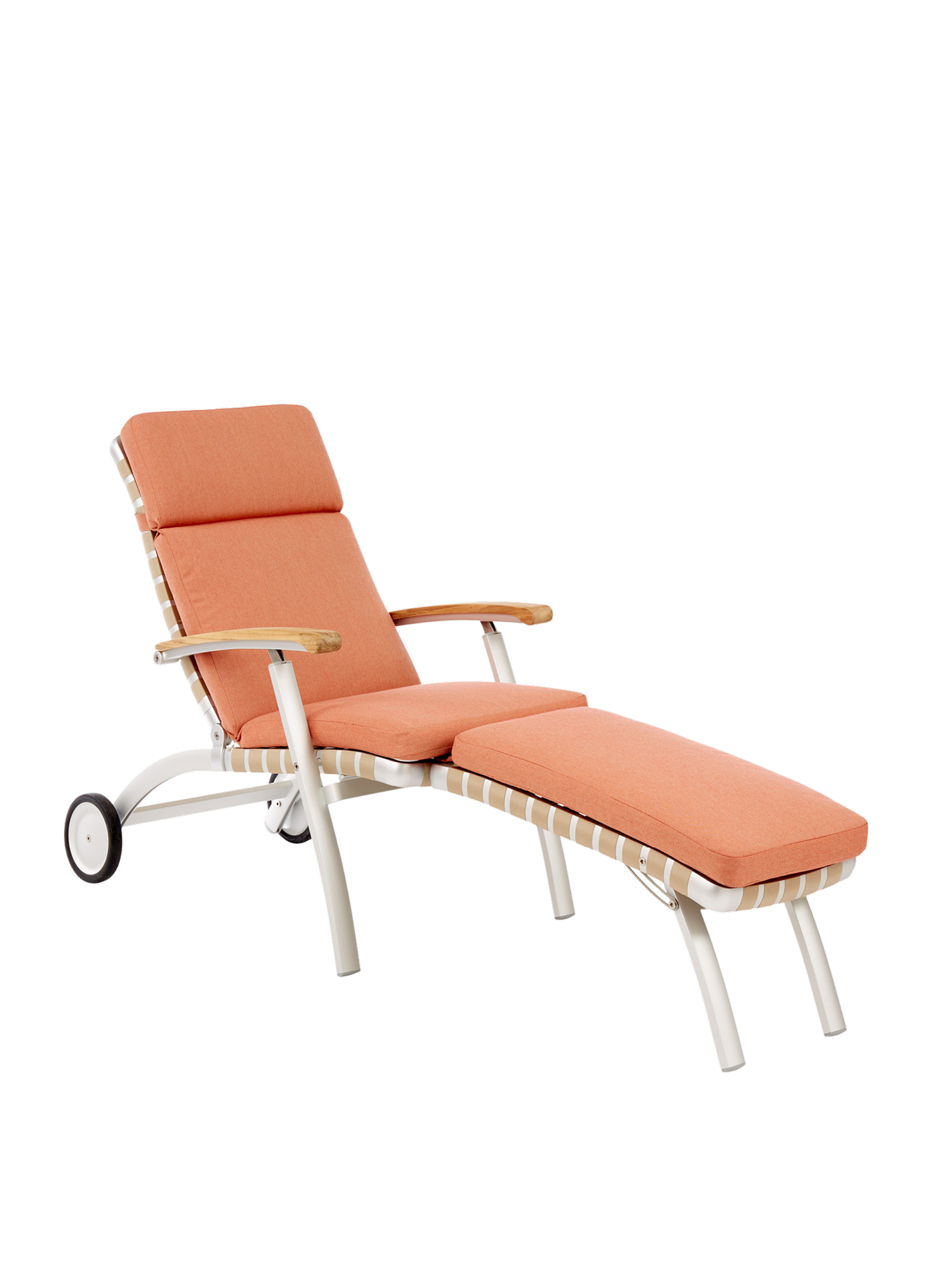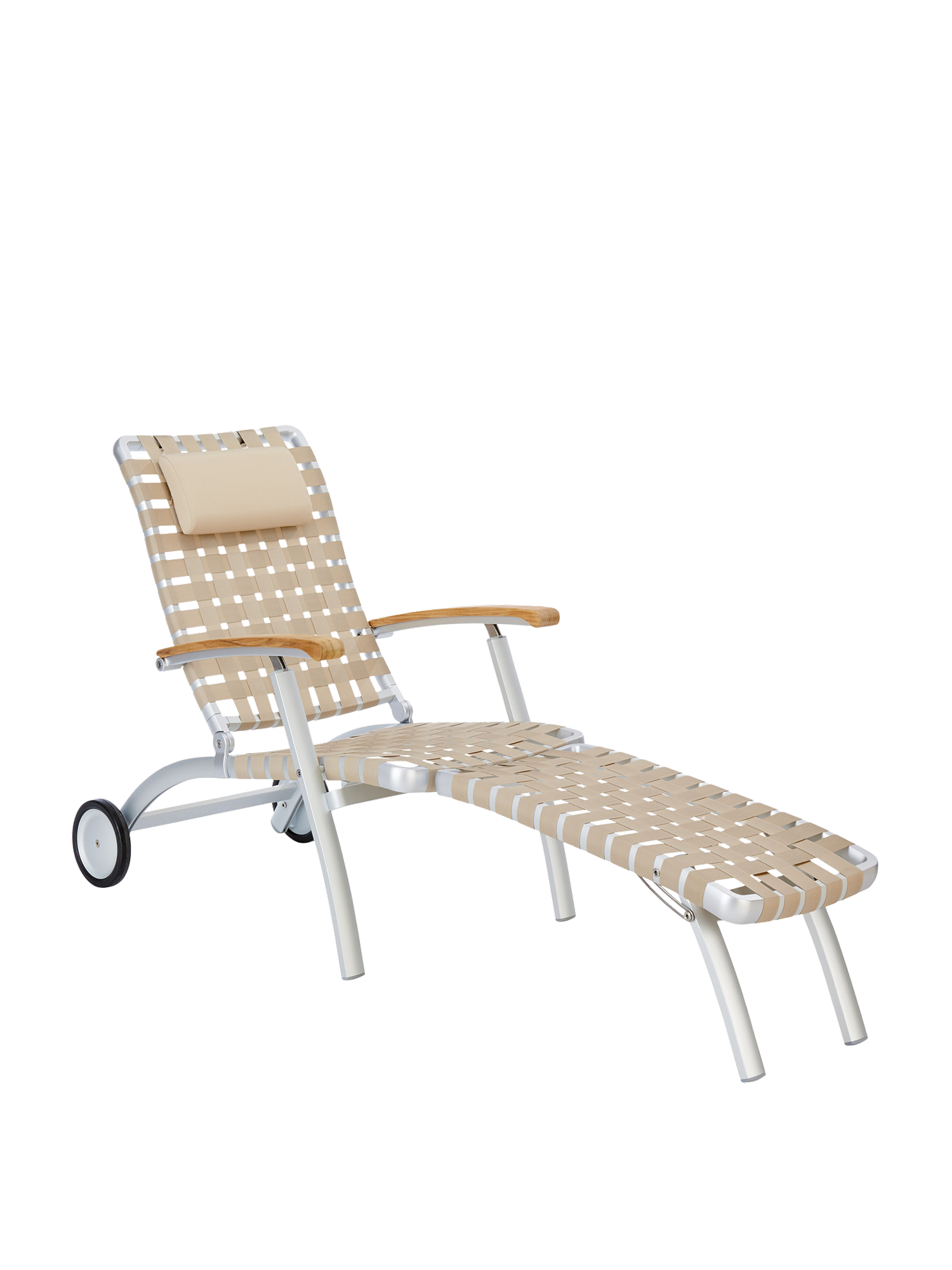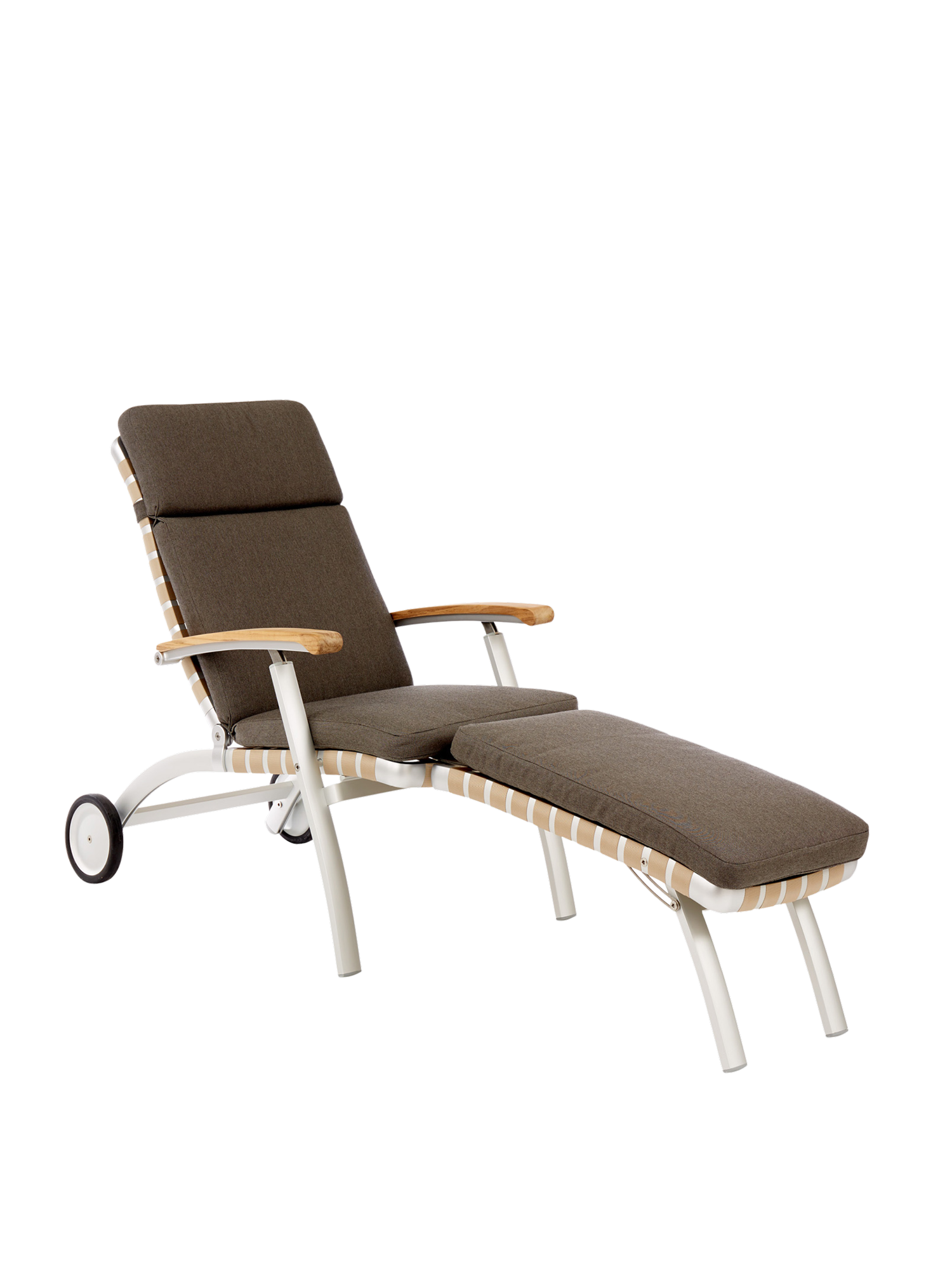 Der silbergrau pulverbeschichtete Aluminiumrahmen des Deck Chairs beschreibt einen eleganten Bogen. Aufwendige Kedertechnik verbindet Rahmen und Geflecht des individuellen Liegestuhls, gewährt angenehmen Halt und bietet ergononischen Komfort. Sanft gewölbte Armlehnen aus Teak schmeicheln den Händen. Mit seiner verlängerten Fussstütze empfiehlt sich der Deck Chair besonders für Menschen ab 1,80 m Körpergrösse. Seine Rückenlehne lässt sich fünffach verstellen. Geliefert wird er mit einer bequemen Nackenrolle im Farbton Pearl.