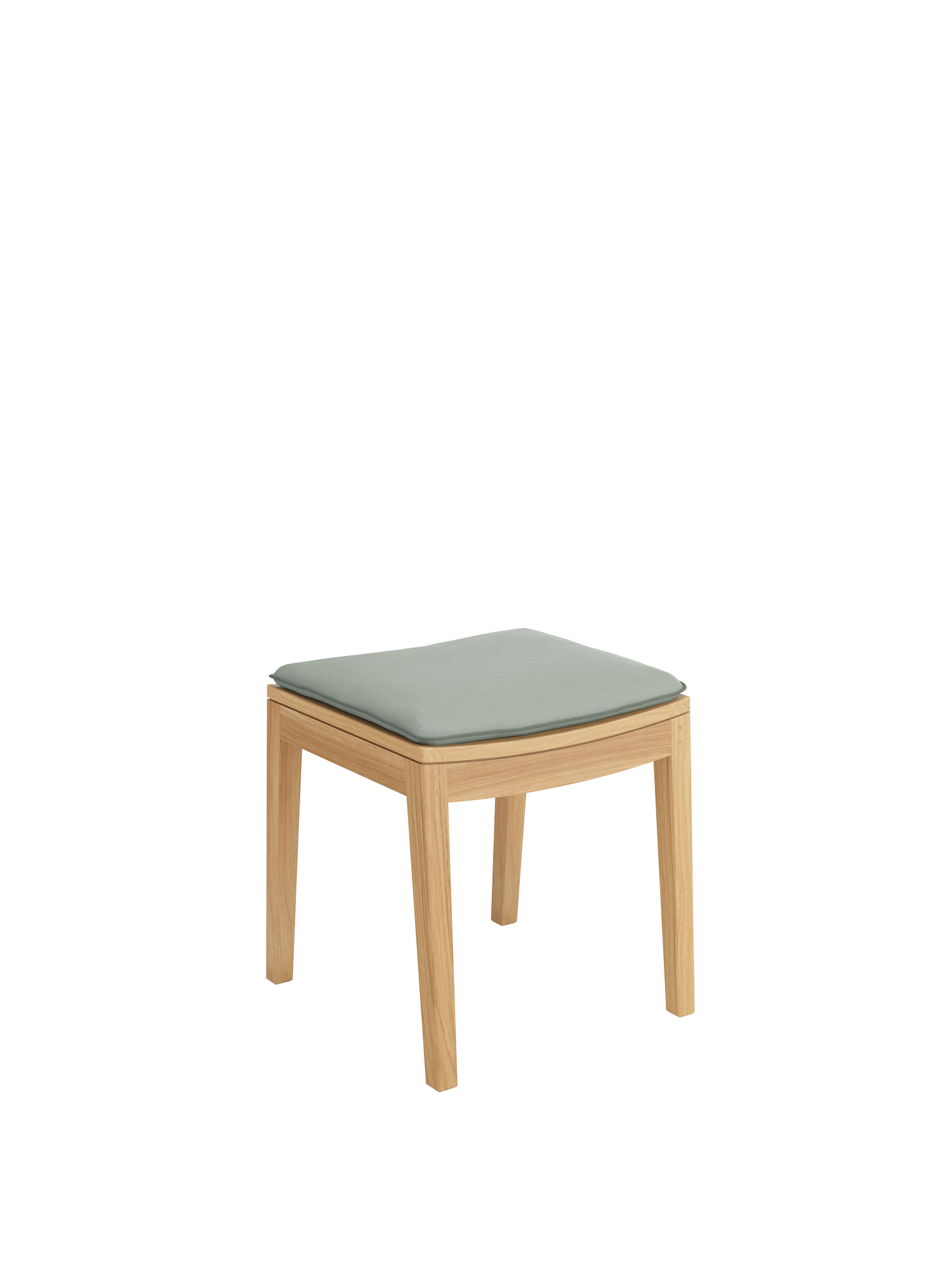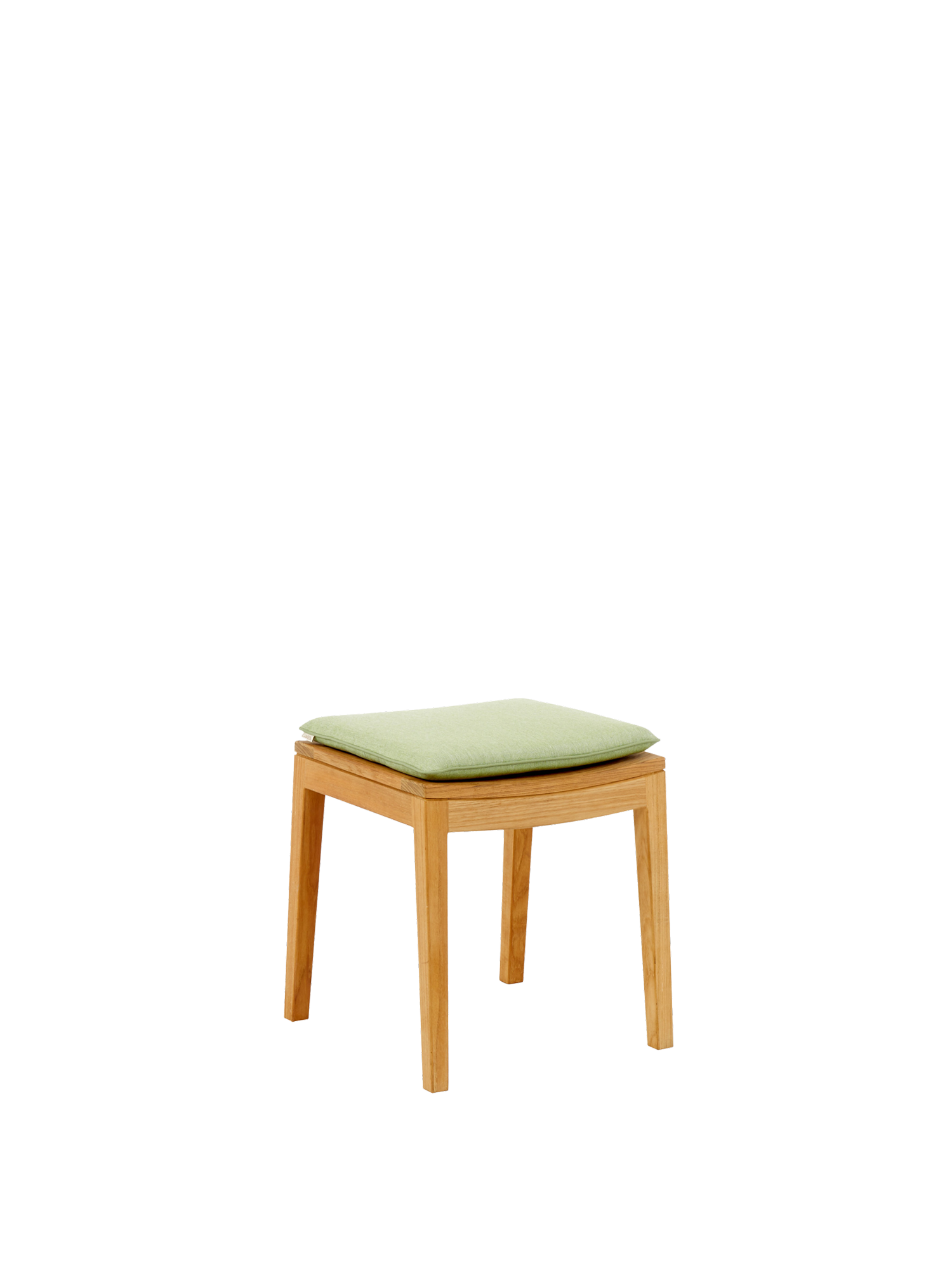 Mit seiner ergonomisch geformten Sitzfläche aus Teak empfiehlt sich der Hocker als unkomplizierter Sitzplatz und komfortable Ablage für die Beine zugleich.