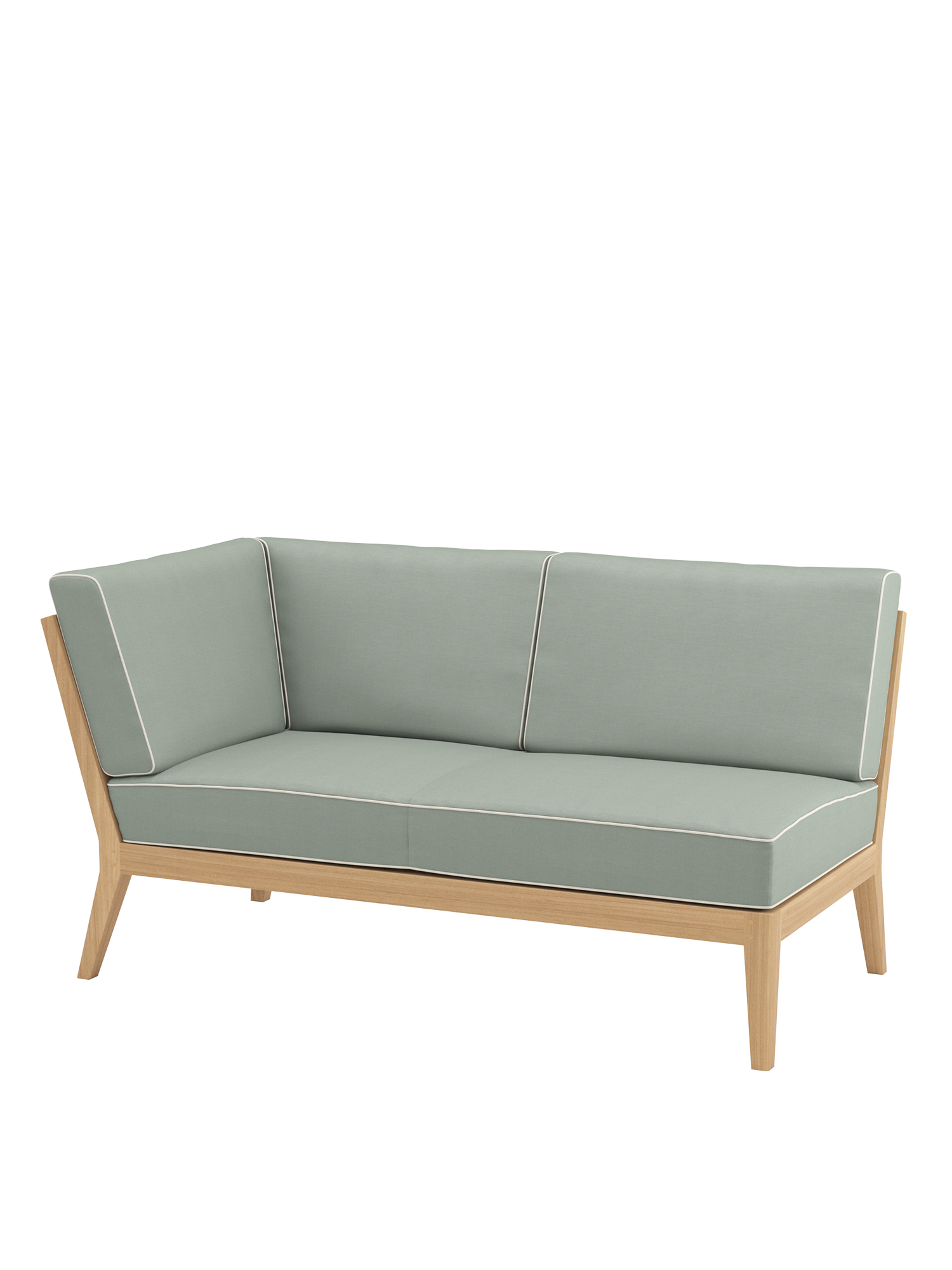 Am Ufer des Schwimmbeckens oder am Rand der Terrasse, auf einem Stadtbalkon oder mitten im Garten: Mit Elementen der Valencia Lounge findet ein Ruhepol in jeder luftigen Lage zur angemessenen Grösse. Extra breit und besonders tief, bieten Chaiselongues, Mittelelemente und Eckmodule aus Teak mit ihren quer verlaufenden Sitz- und Rückenlehnen und ausgestellten Beinen viel Raum zum Anlehnen. Dicke, von Kedern gerahmte Polster und Federkissen in frischen Farben setzen dazu sommerliche Akzente.