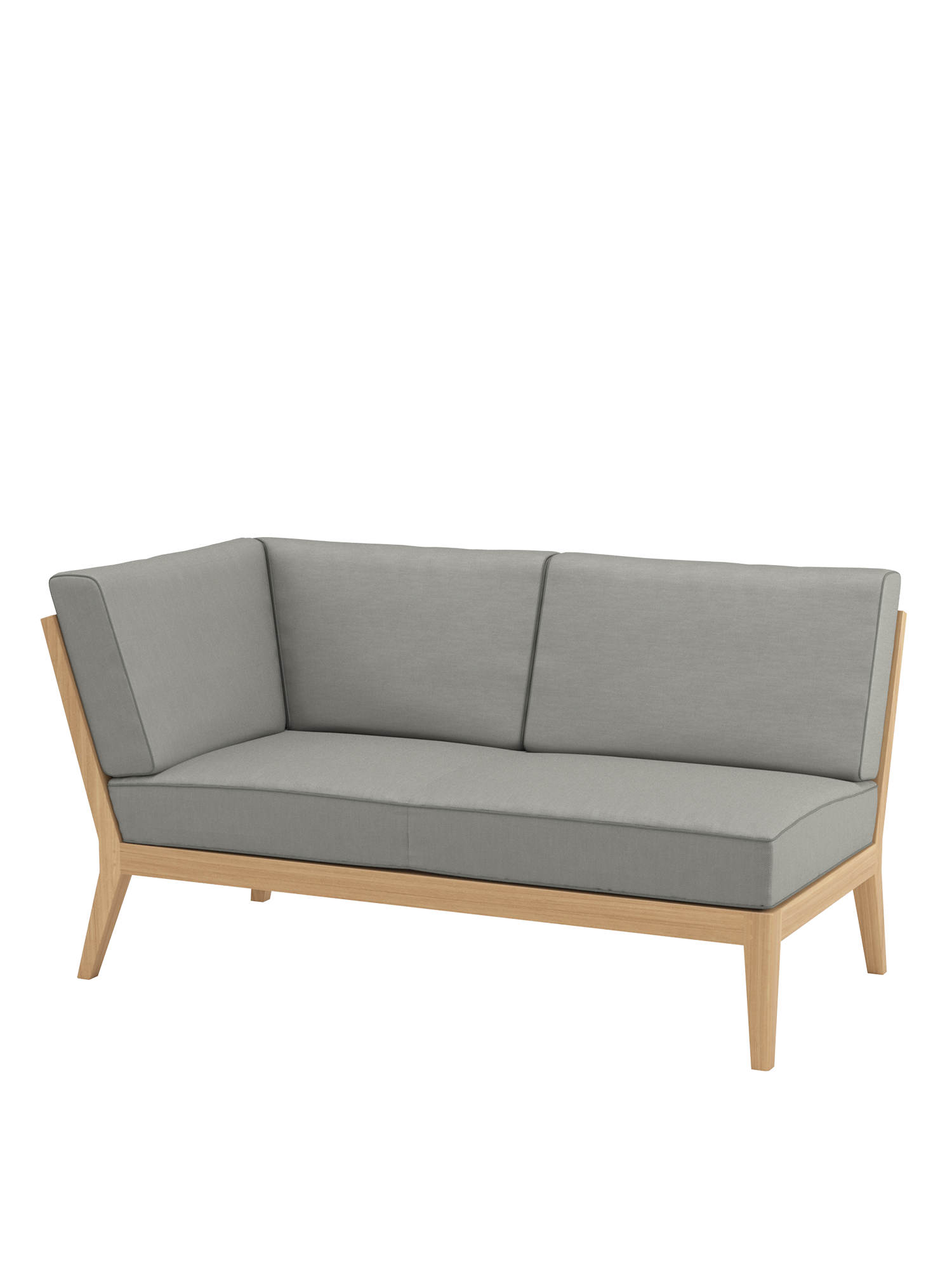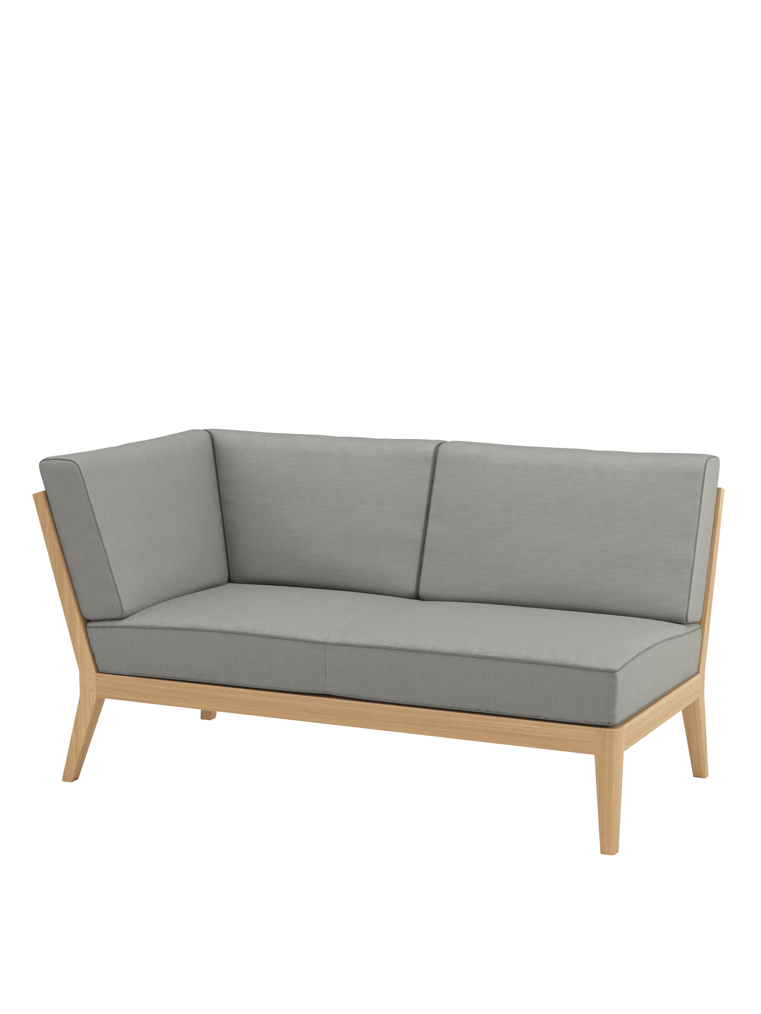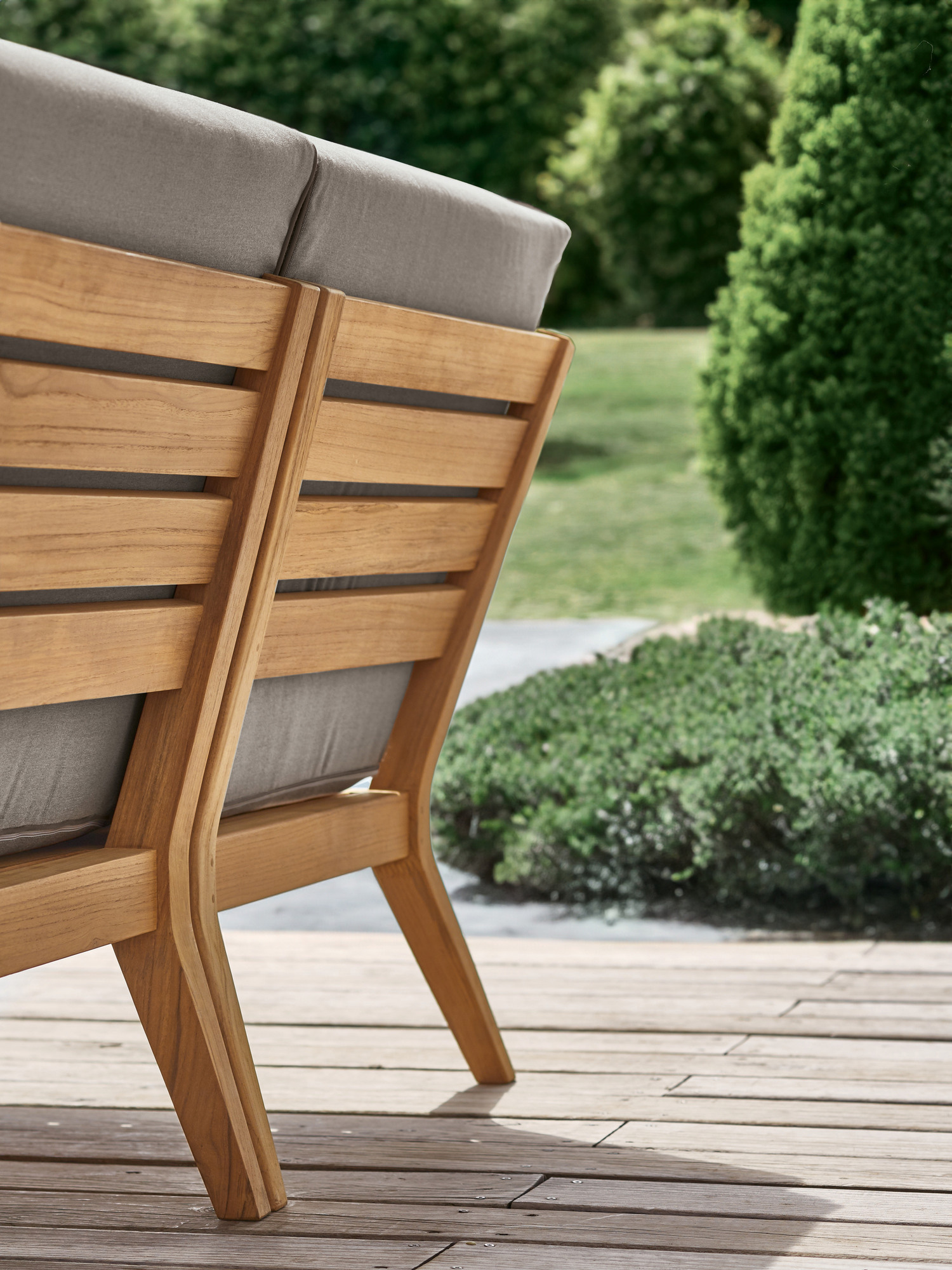 Am Ufer des Schwimmbeckens oder am Rand der Terrasse, auf einem Stadtbalkon oder mitten im Garten: Mit Elementen der Valencia Lounge findet ein Ruhepol in jeder luftigen Lage zur angemessenen Grösse. Extra breit und besonders tief, bieten Chaiselongues, Mittelelemente und Eckmodule aus Teak mit ihren quer verlaufenden Sitz- und Rückenlehnen und ausgestellten Beinen viel Raum zum Anlehnen. Dicke, von Kedern gerahmte Polster und Federkissen in frischen Farben setzen dazu sommerliche Akzente.