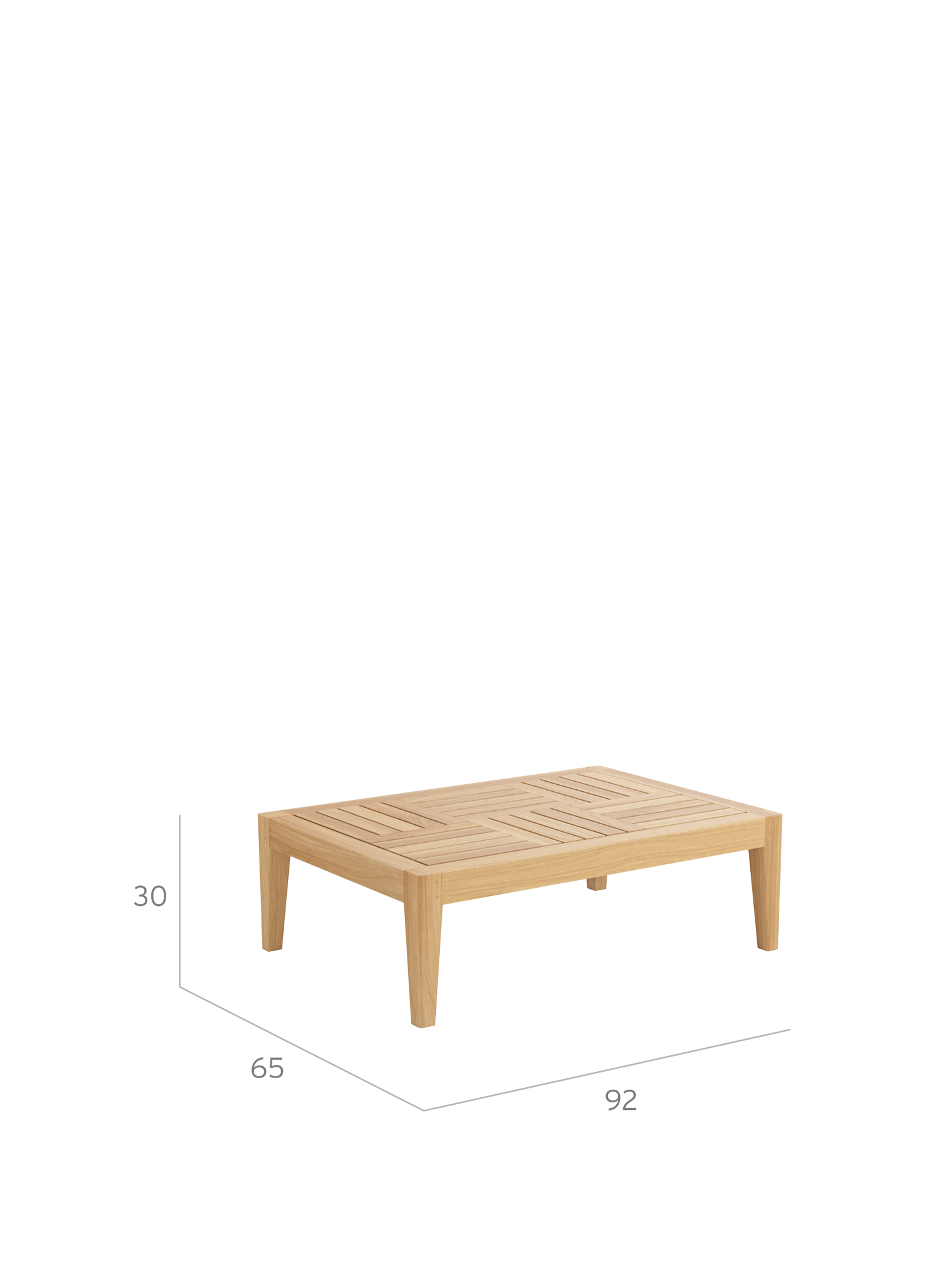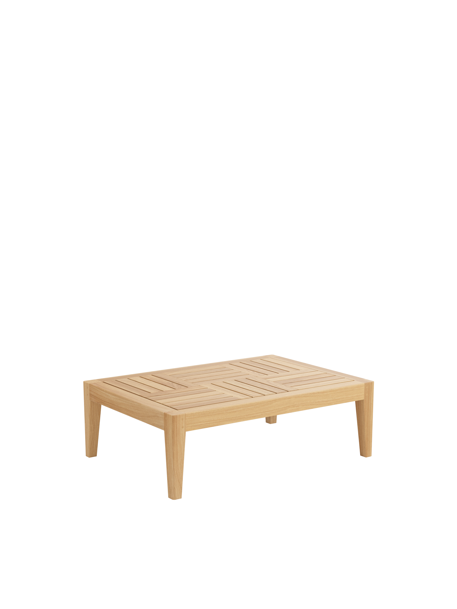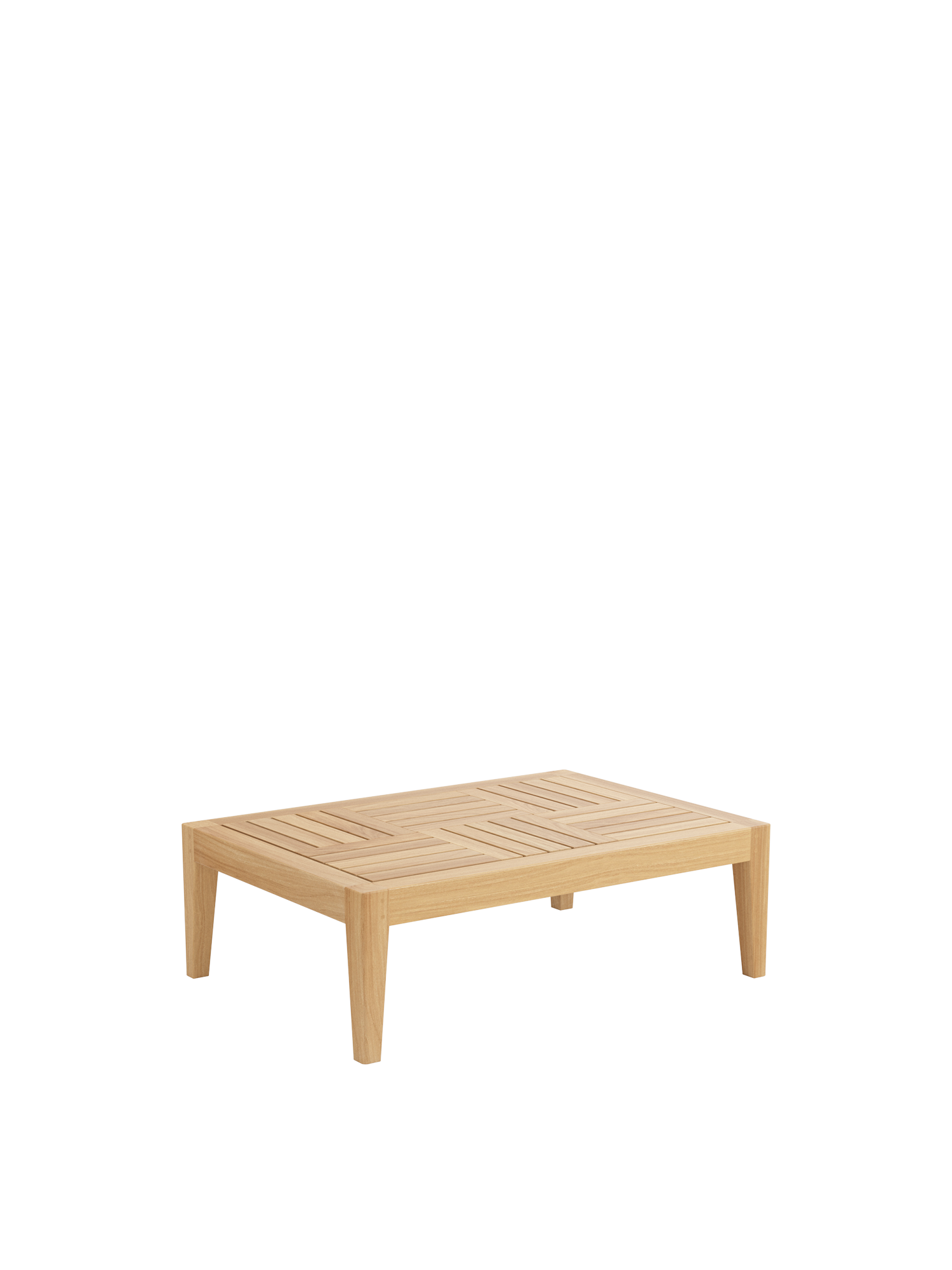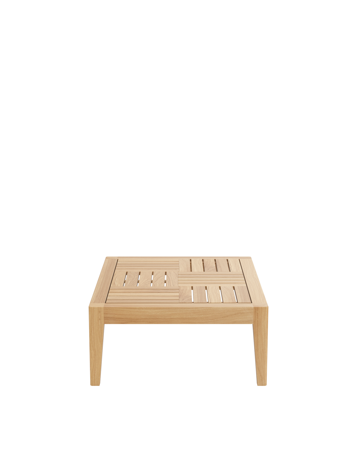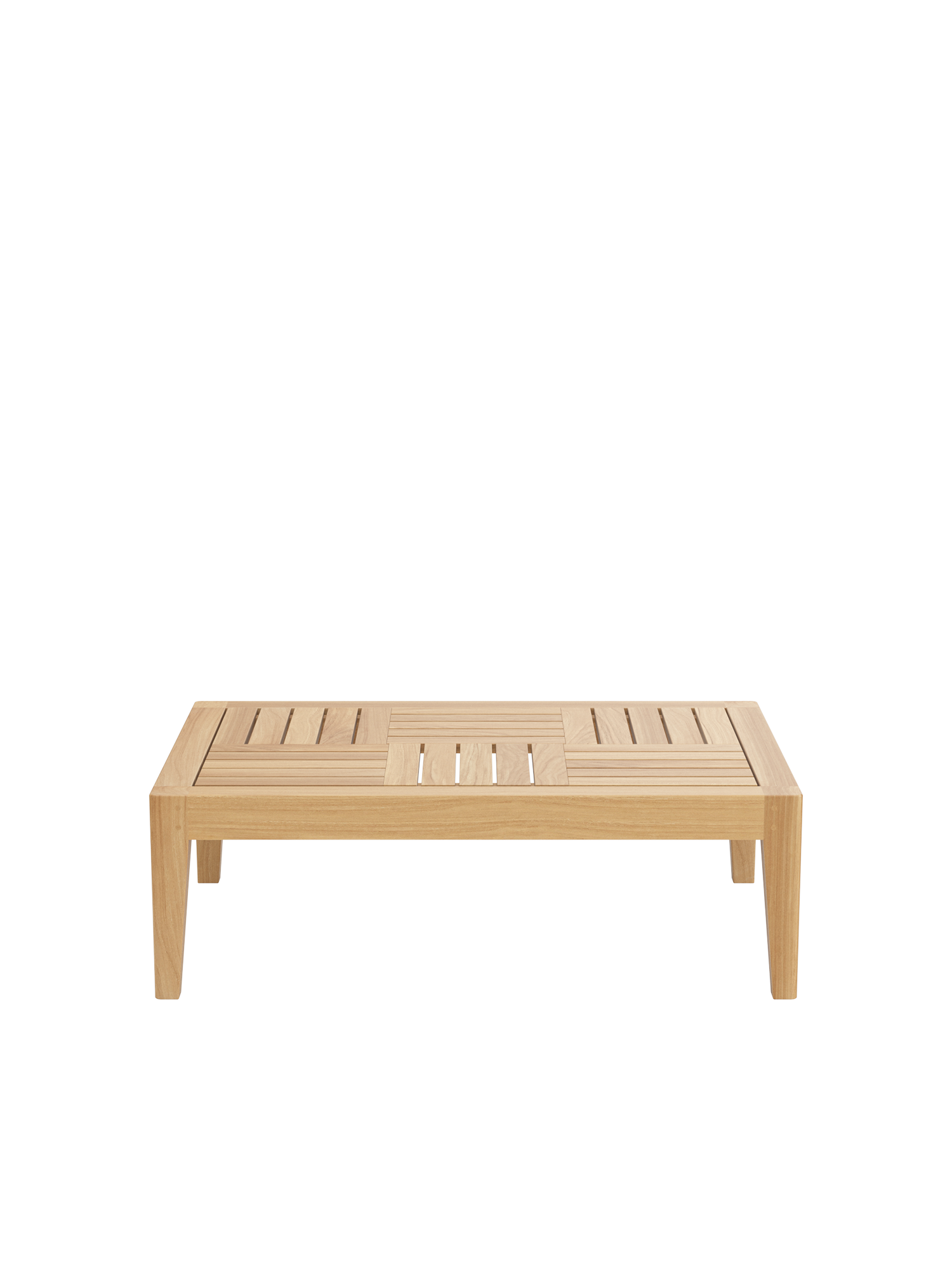 Der passende, niedrige Couchtisch trägt eine Platte aus hochwertigem, wetterfestem Teak.