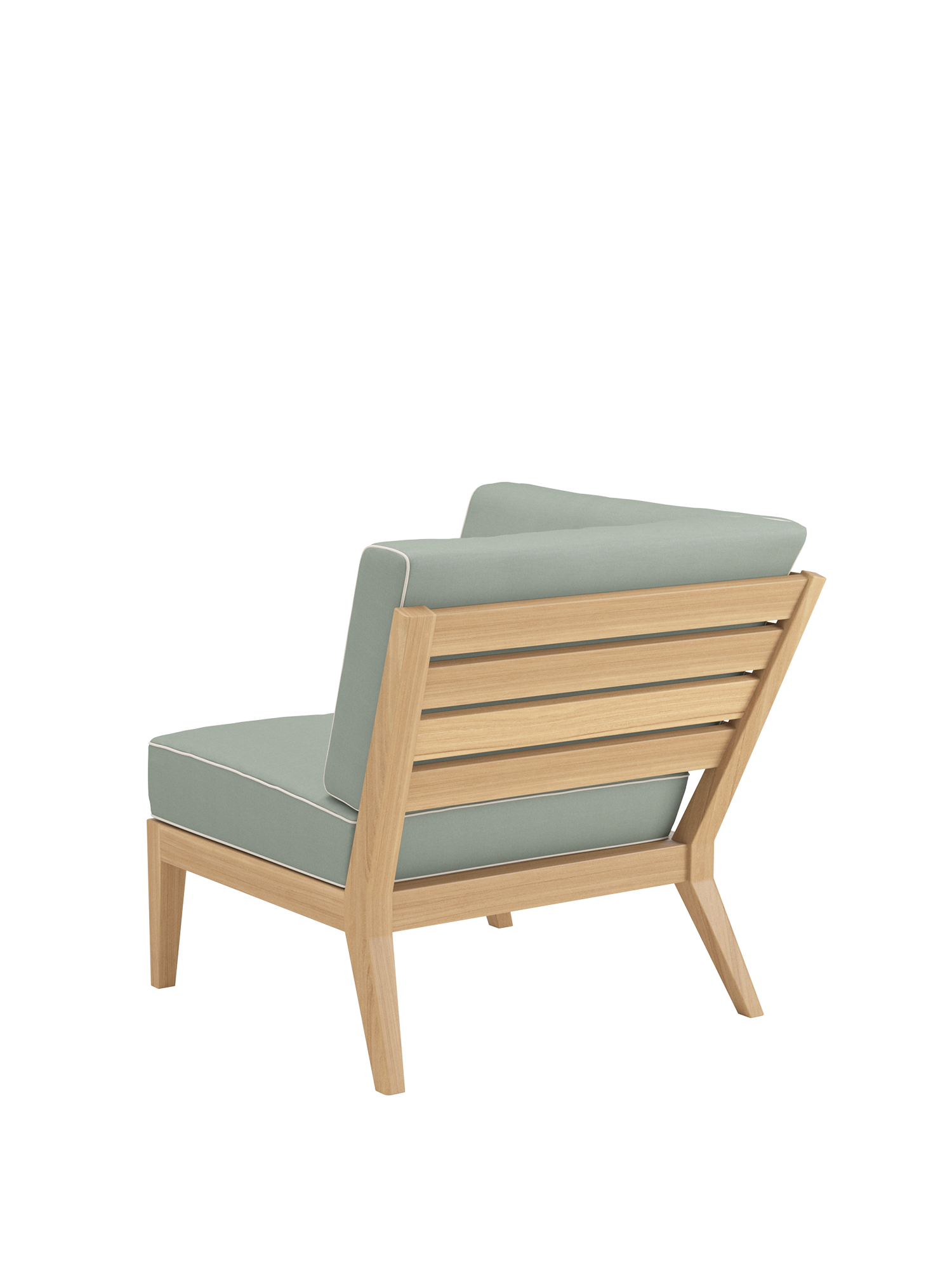 Am Ufer des Schwimmbeckens oder am Rand der Terrasse, auf einem Stadtbalkon oder mitten im Garten: Mit Elementen der Valencia Lounge findet ein Ruhepol in jeder luftigen Lage zur angemessenen Grösse. Extra breit und besonders tief, bieten Chaiselongues, Mittelelemente und Eckmodule aus Teak mit ihren quer verlaufenden Sitz- und Rückenlehnen und ausgestellten Beinen viel Raum zum Anlehnen. Dicke, von Kedern gerahmte Polster und Federkissen in frischen Farben setzen dazu sommerliche Akzente.