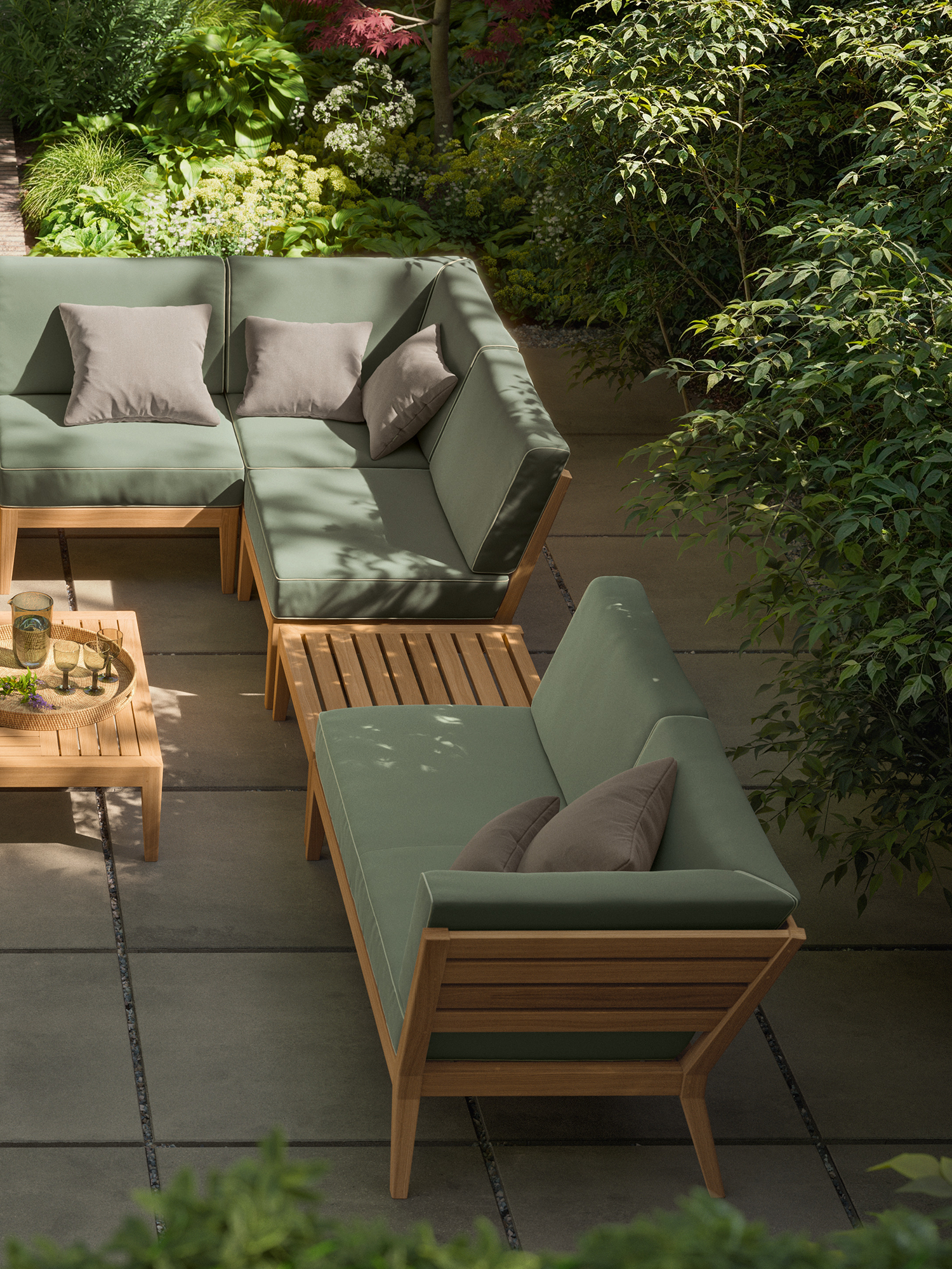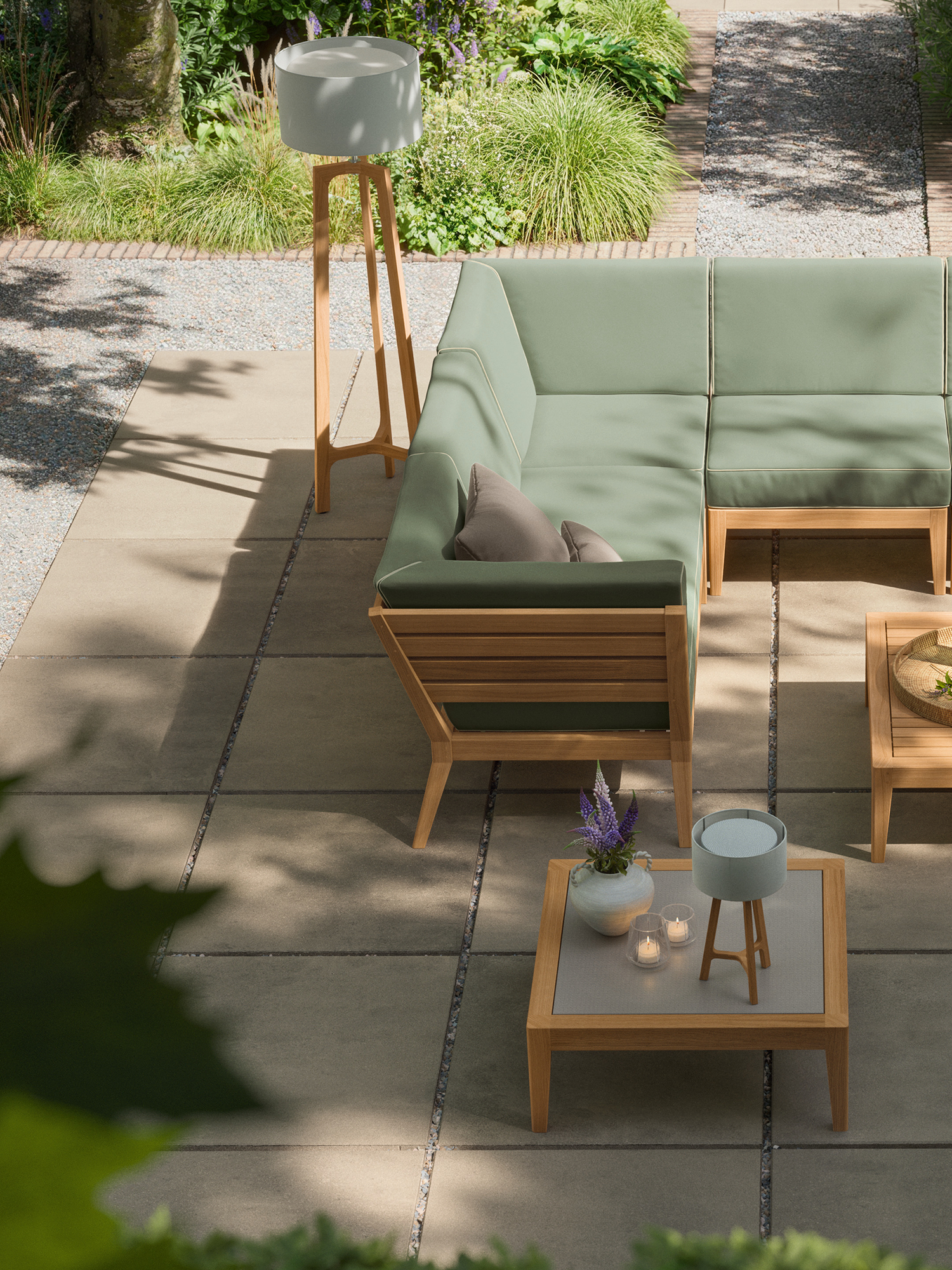 Am Ufer des Schwimmbeckens oder am Rand der Terrasse, auf einem Stadtbalkon oder mitten im Garten: Mit Elementen der Valencia Lounge findet ein Ruhepol in jeder luftigen Lage zur angemessenen Grösse. Extra breit und besonders tief, bieten Chaiselongues, Mittelelemente und Eckmodule aus Teak mit ihren quer verlaufenden Sitz- und Rückenlehnen und ausgestellten Beinen viel Raum zum Anlehnen. Dicke, von Kedern gerahmte Polster und Federkissen in frischen Farben setzen dazu sommerliche Akzente.