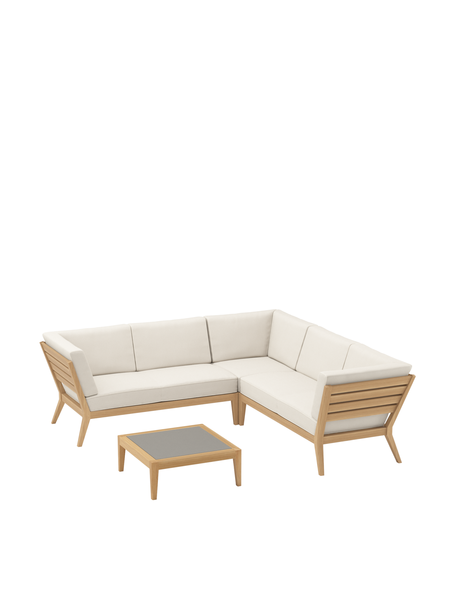 Die beiden Chaiselongues mit Armlehnen auf der rechten bzw. auf der linken Seite nehmen das Eckelement galant in ihre Mitte. Gemeinsam lädt das Trio mit grosszügigen Polstern zu behaglichen Ruhepausen ein. Der Couchtisch mit einer Keramikoberfläche fügt sich nahtlos in das stimmige Gesamtbild der Valencia Lounge Kollektion ein.