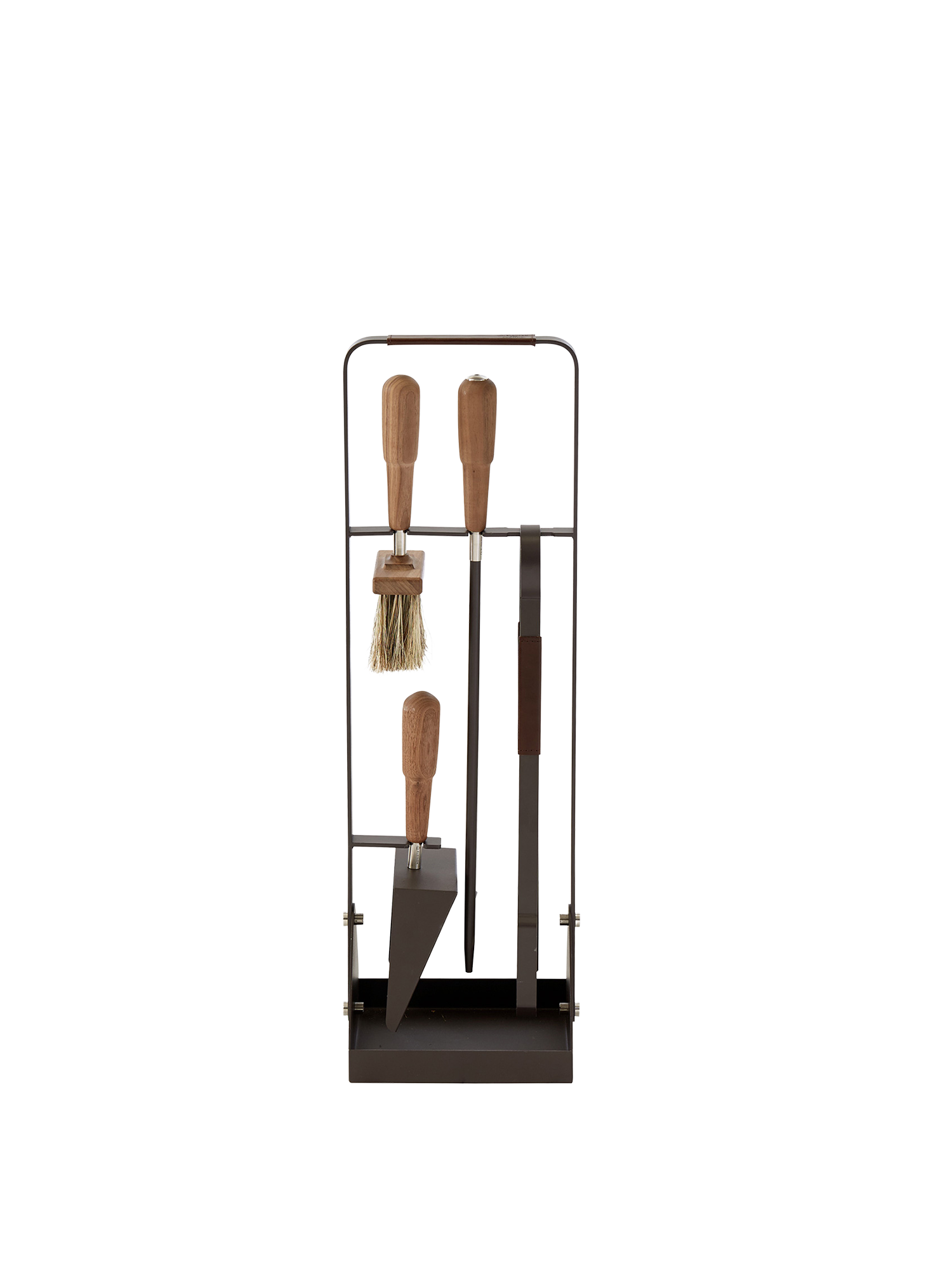 Griffe aus Nussbaum, Borsten aus Rosshaar und edle Lederdetails kennzeichnen das aussergewöhnliche Set. Es besteht aus Zange, Bürste, Schaufel und einem Schürhaken mit Blasebalgfunktion. Gestell und Besteck sind aus pulverbeschichtetem Metall.