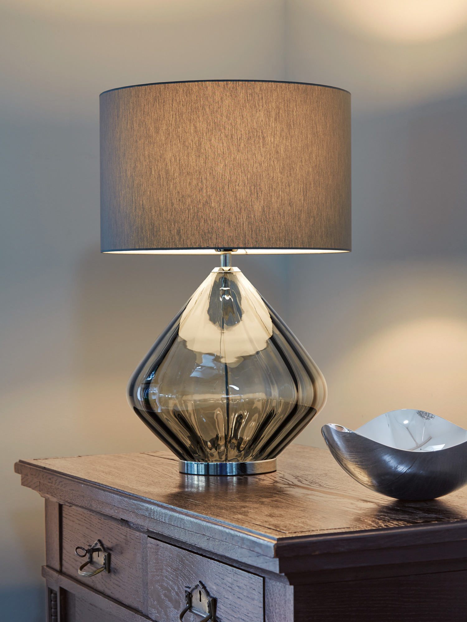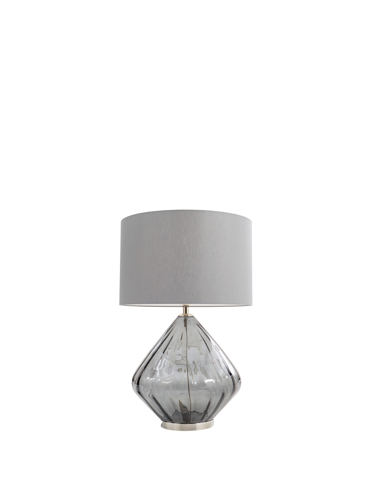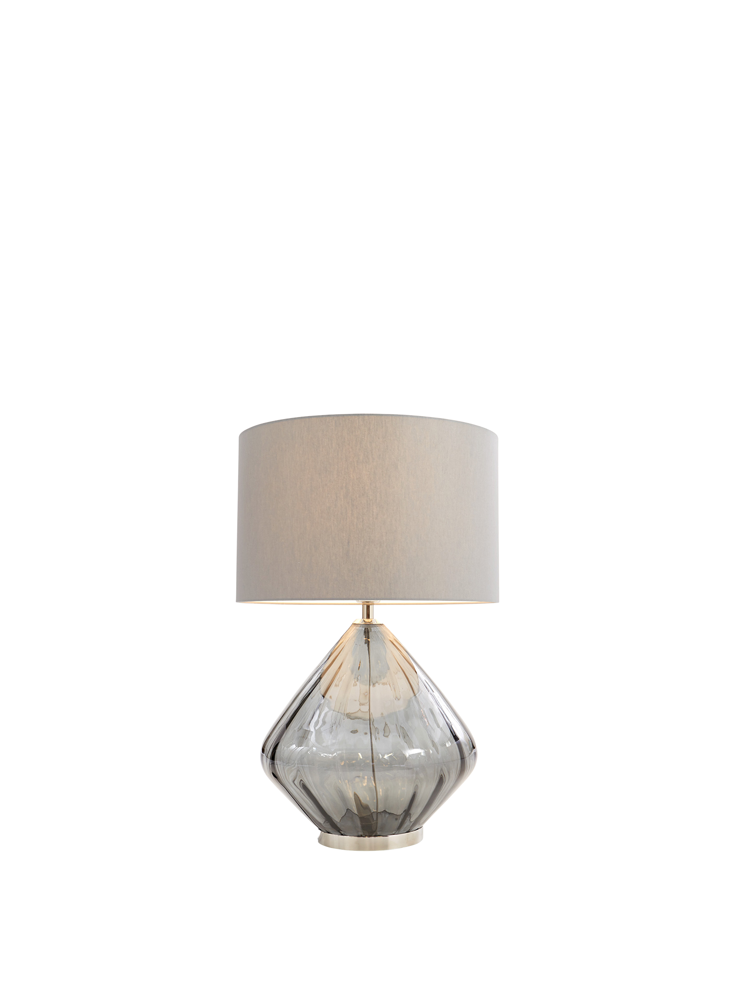 Das rauchgraue Glasgefäss wird von Hand gefertigt und ruht auf einem glänzenden, schmalen Fuss aus vernickeltem Edelstahl. Der grosse runde Schirm ist mit grauem Chintz bezogen und blendfrei ausgestattet. Die Fassung besteht aus Messing.